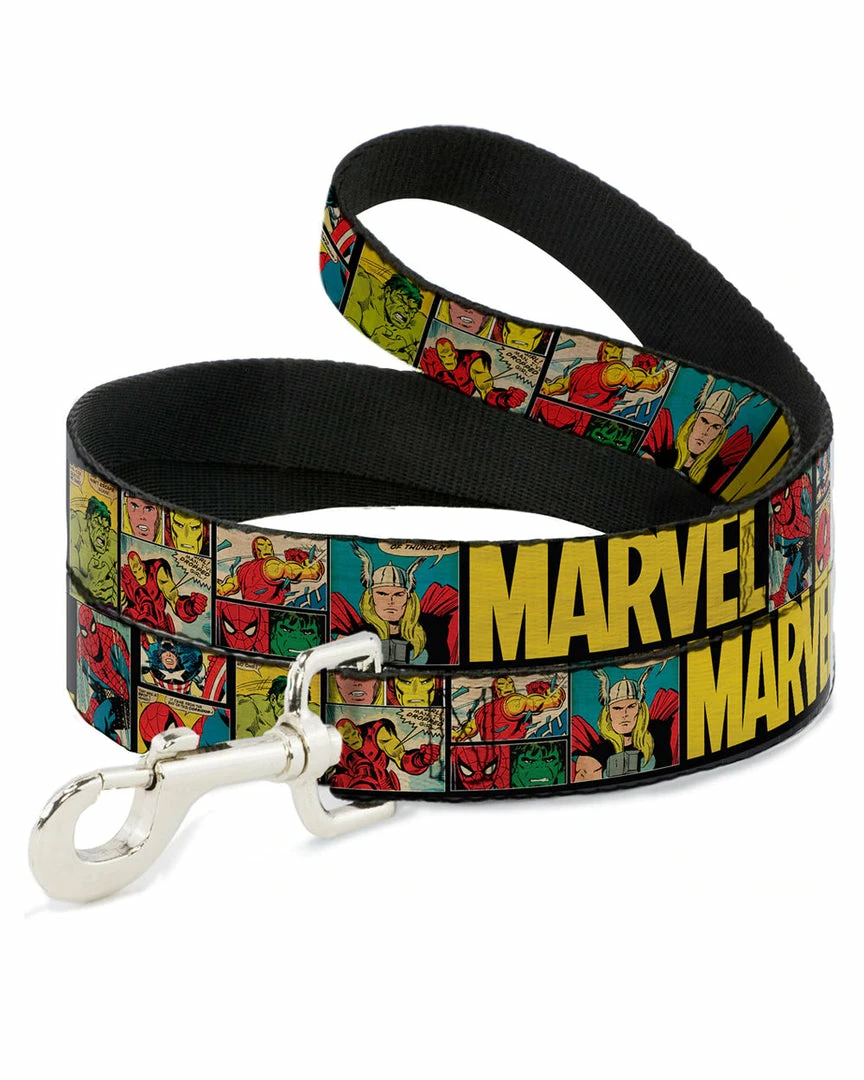 This fashion-forward dog leash is a great way to show off your favorite characters or brands. The durable components and beautiful printing ensure that the colors will continue to pop for years to come! It is made of high-density polyester and steel hardware. The leash is available in 0.5, 1.0 and 1.5 inches wide, and 4 and 6 feet in length. This product is Made in the USA by Buckle-Down Inc. and officially licensed by Marvel Comics.