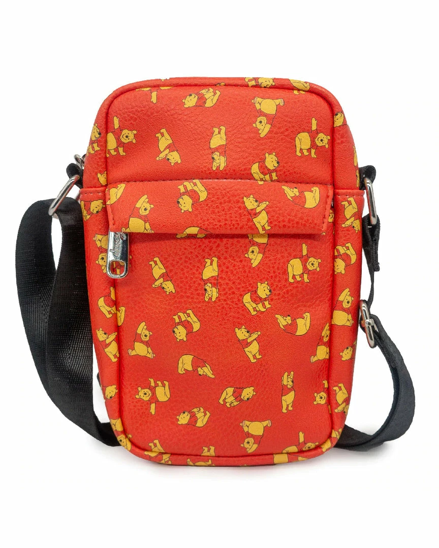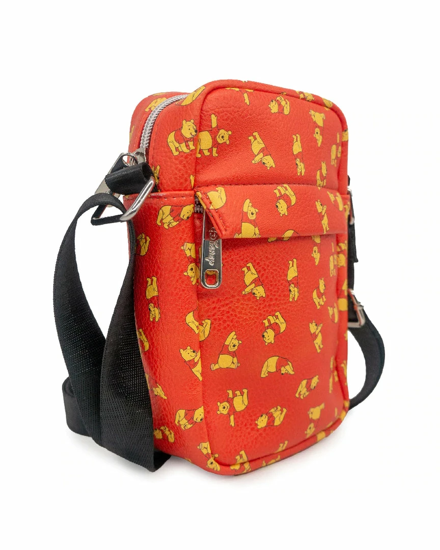 - You’re going to love this Disney bag featuring Winnie the Pooh stretching poses all over! Stylish and sleek cross body bag is made from premium vegan leather. It measures 8.0 x 5.5 x 2.0 Inches and features space to carry all your favorite things including phone, wallet, keys, etc. The gorgeous artwork is applied using the latest printing technology so it will hold up well over time. This product is made by Buckle-Down and is Officially Licensed by Disney.