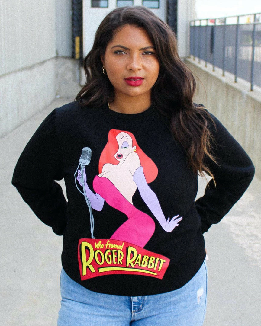 Show your love for one of the most iconic cartoon women in history in this Jessica Rabbit crewneck featuring printed details of her truly unforgettable performance scene.