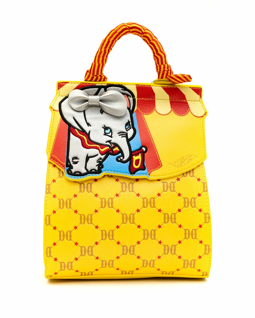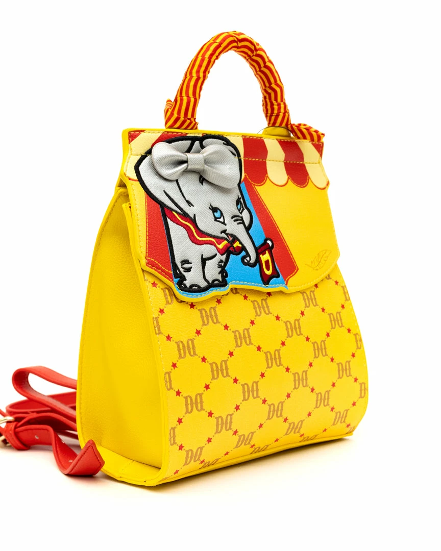 custom monogram backpack. Designed with a primary color scheme and including hints of circus details, the front flap features adorable Dumbo holding a flag with his signature “D” and a 3D bow on his ears. This backpack has a yellow pebble base, a red and yellow scarf wrapped handle, and metallic and embroidered accents. Not only cute but also functional, this bag has adjustable backpack straps, and an interior back wall pocket and front interior pocket. Carry all your essentials and share your love for this sweet elephant!