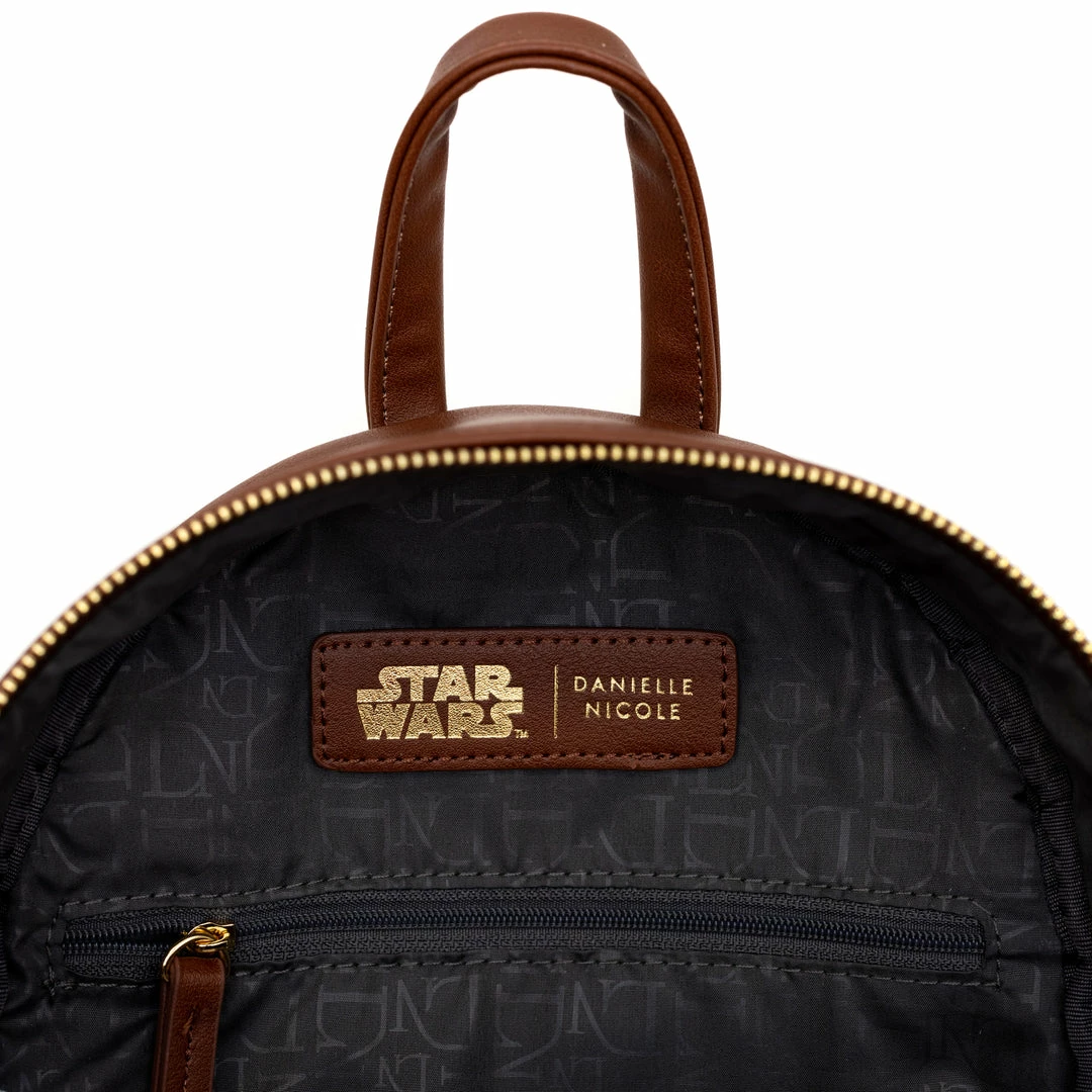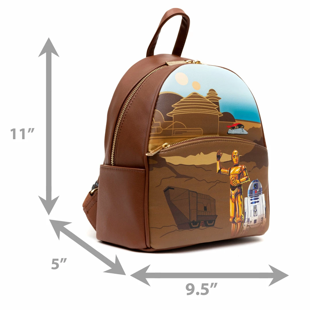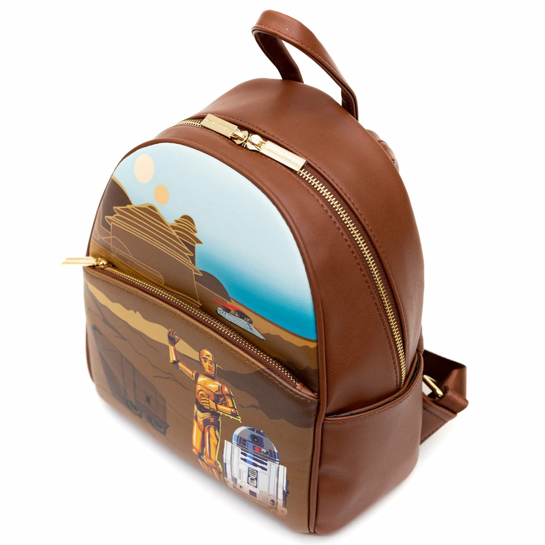 - You’re going to love this cute backpack featuring Star Wars Droids C-3PO and R2D2. This mini backpack features include sturdy gold toned metal hardware, adjustable straps, side pockets, and is made of vegan leather (polyurethane)