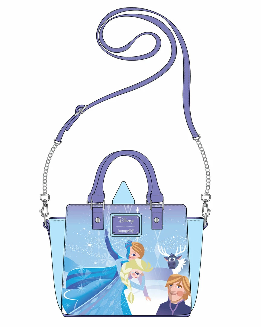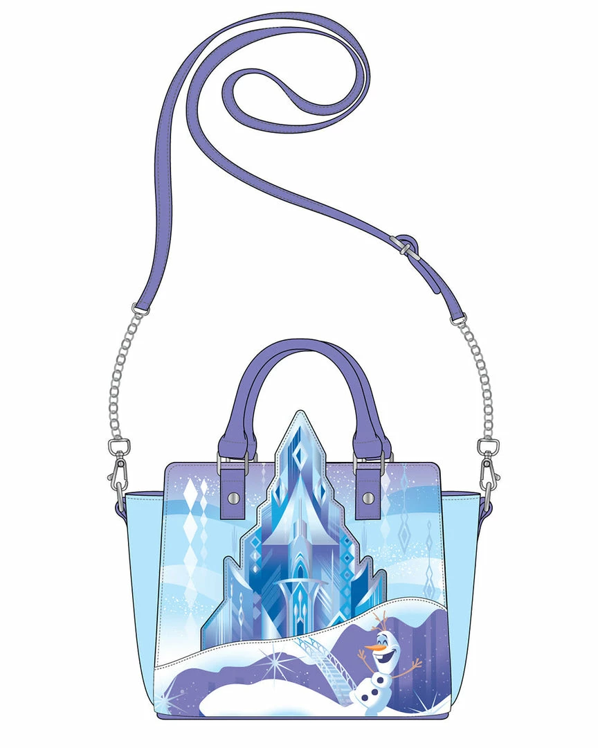 Glide along a shimmering frozen wonderland with Olaf on this Frozen Princess Elsa Castle Cross Body Bag. On the front of the bag, Olaf slides on the ice in front of the palace, which reaches up and over the top of the purse and glimmers with iridescent silver foil details. On the back, Elsa, Anna, Kristoff, and Sven make an appearance. This accessory complements any Disney outfit and is perfect for fans who are looking to keep their favorite animated moments close.