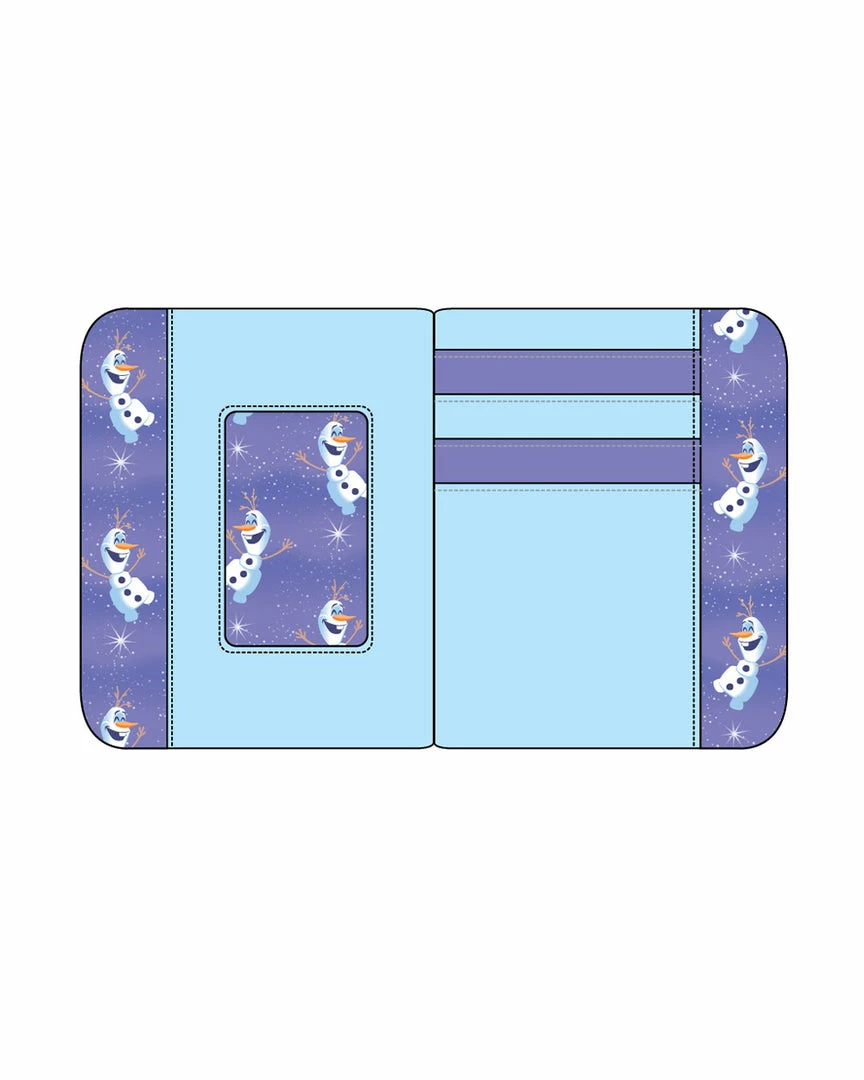 Glide along a shimmering frozen wonderland with Olaf on this Frozen Princess Elsa Castle Zip Around Wallet. On the front, Olaf slides on the ice in front of the sparkling palace, which reaches up over the top of the wallet and shimmers with iridescent silver foil detail. On the back, Elsa, Anna, Kristoff, and Sven make an appearance. This accessory makes for a great complement to any Disney outfit and is perfect for fans who are looking to keep their favorite animated moments close.