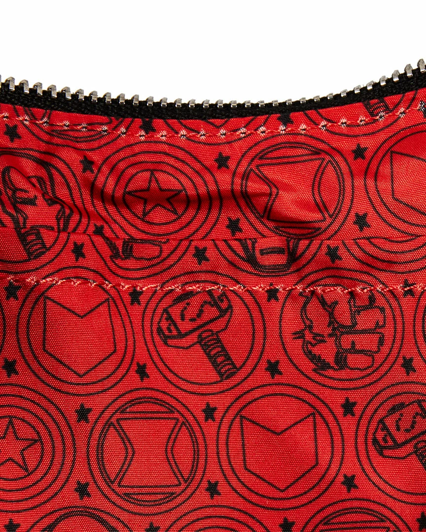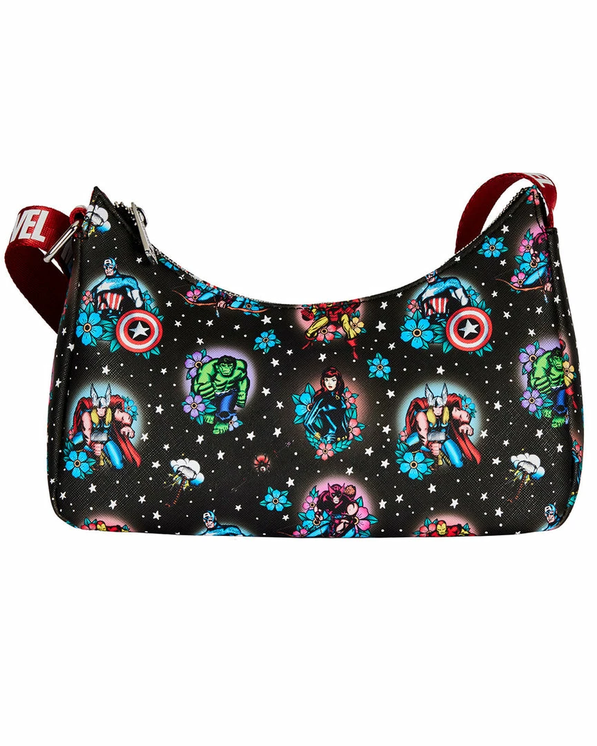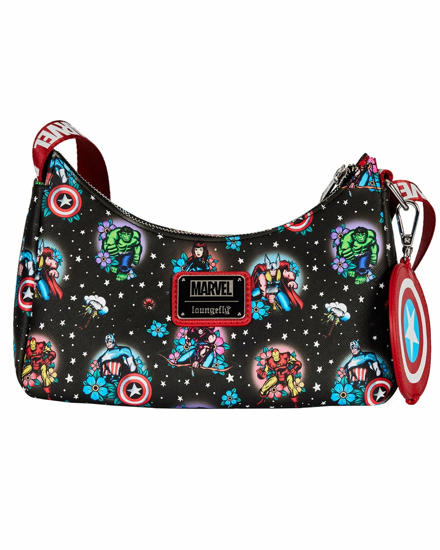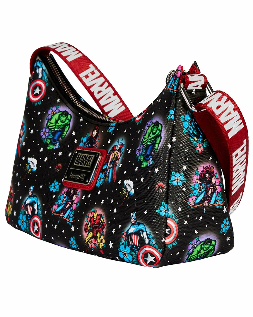 Assemble a superhero team to help you power through your day with this Marvel Avengers Floral Tattoo Shoulder Bag. Captain America, the Hulk, Iron Man, Thor, the Black Widow, and Hawkeye gather in a classic rose tattoo motif on this baguette shoulder bag. A galactic star pattern serves as a background, and Captain America’s shield is a coin bag on the shoulder strap. The word “Marvel” appears in white in all capital letters on the red shoulder strap, which is also adjustable. It’s the perfect accessory for carrying your necessities in superhero style.