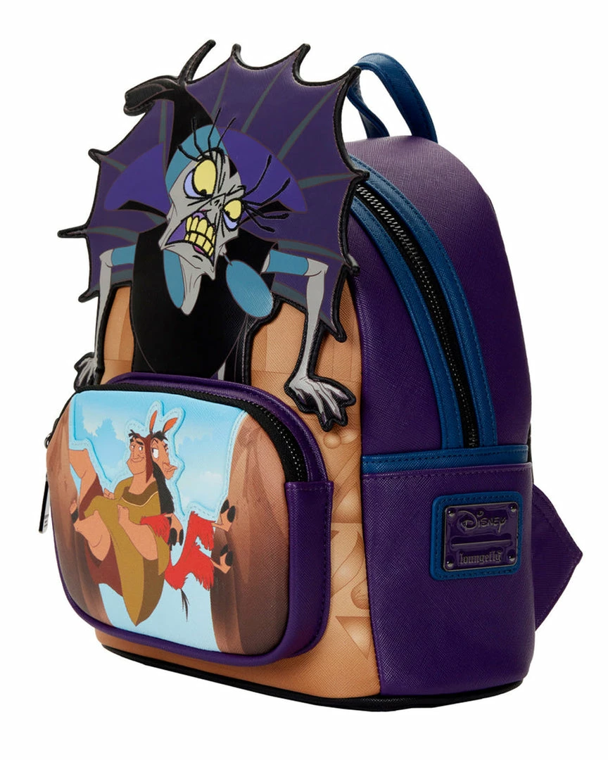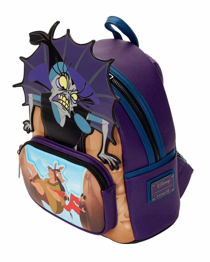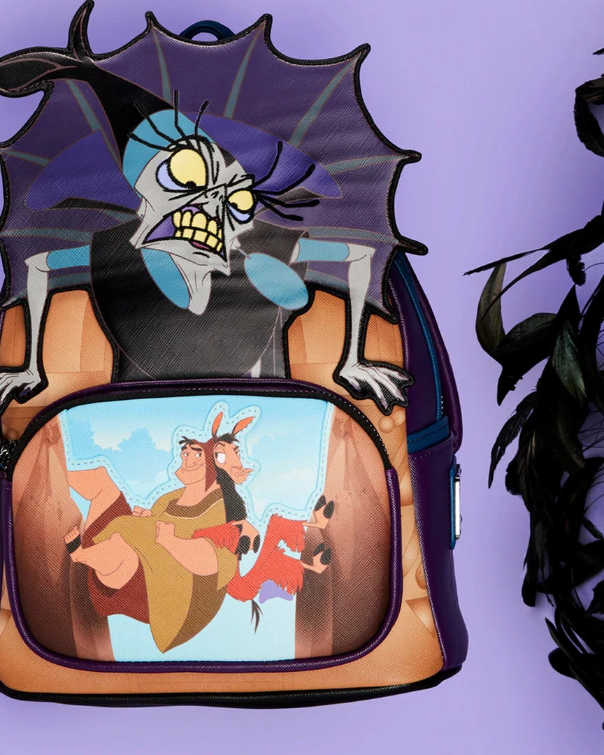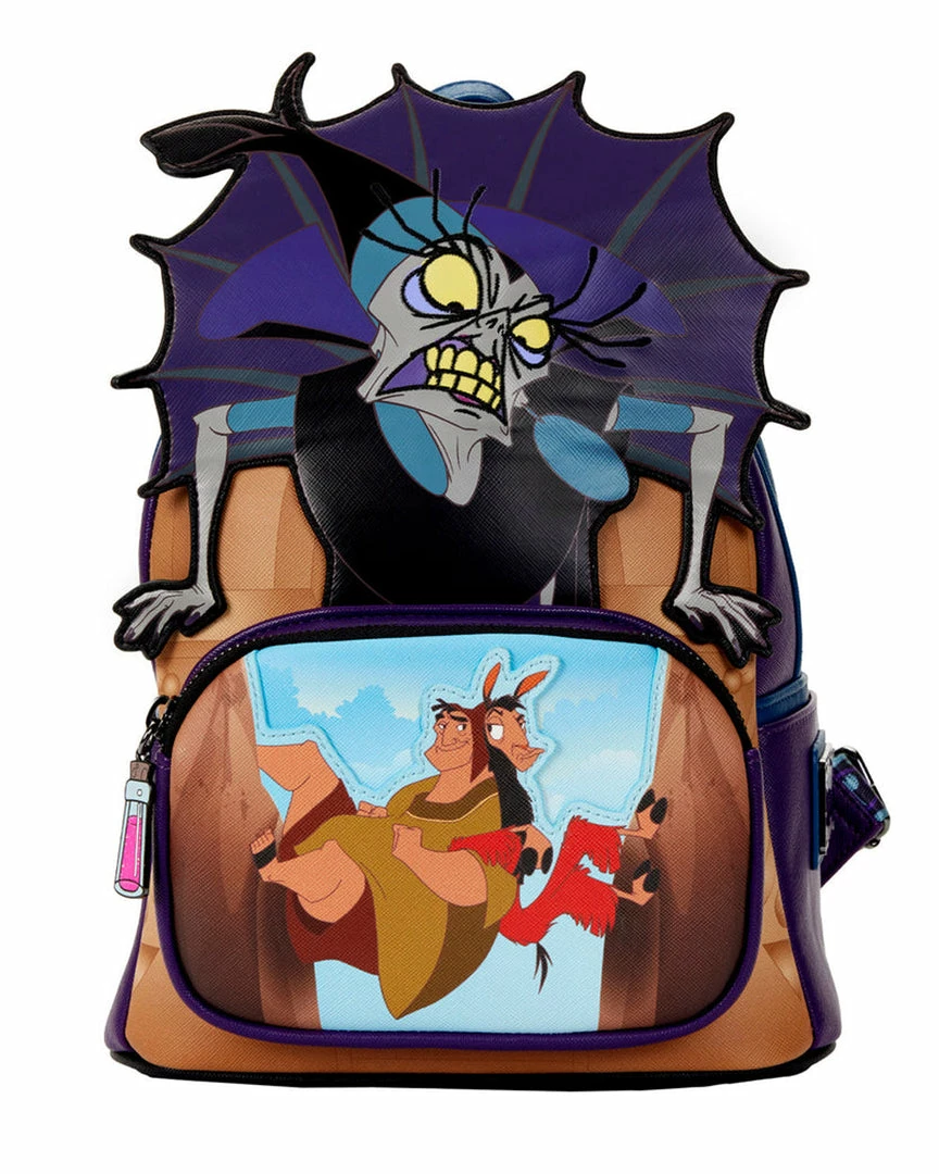 A furious storm has cast Yzma into a rage as she struggles to rescue the potion that will turn Kuzko back into a human. Contain her wrath with this The Emperor’s New Groove Yzma Villains Scene Mini Backpack. On the front of the backpack, Yzma comes to life in applique detail, glaring down and over the image on the front zipped compartment of Kuzko and Pacha, climbing together between narrow cliffs, escaping with the potion. On the back, Yzma poses as a triumphant cat who momentarily manages to capture the potion. In fact, an enamel zipper charm of the potion, in glitter detail, completes the scene. This backpack is a great accessory for any Disney outfit.