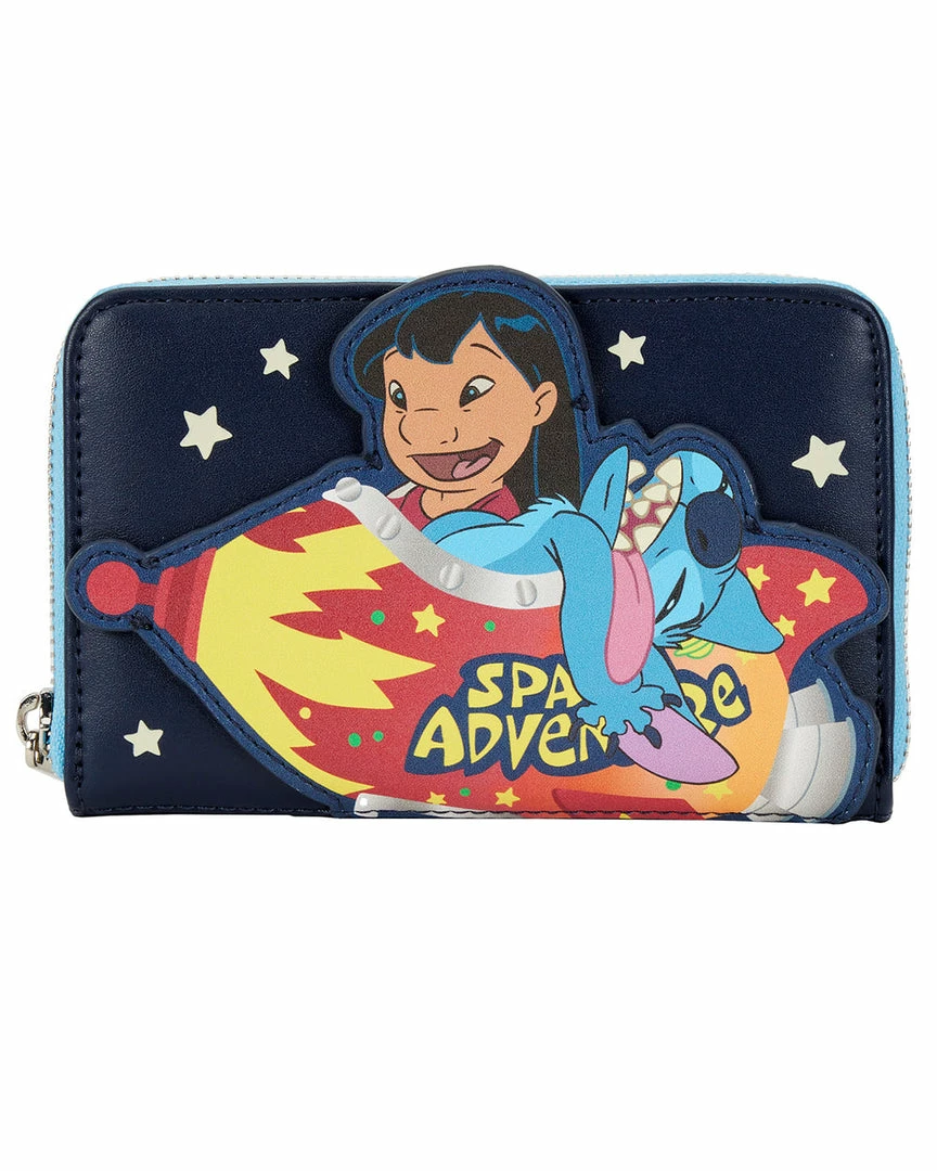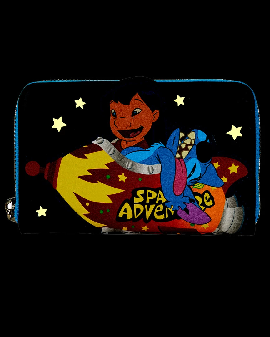 A coin-operated rocket ride provides out-of-this-world adventure for the imaginative duo, Lilo and Stitch. Have a blast taking them with you as this Lilo & Stitch Space Adventure Glow in the Dark Zip Around Wallet. On the front of the wallet, Lilo and Stitch have managed to fly to outer space in the coin-operated “Space Adventure” rocket ship. Even the stars around them glow in the dark! Lilo is having too much fun to notice that the ride might be a bit much for Stitch to handle. On the back side, planets and stars surround the words “Space Adventure.” In fact, the star and planet also glow in the dark.