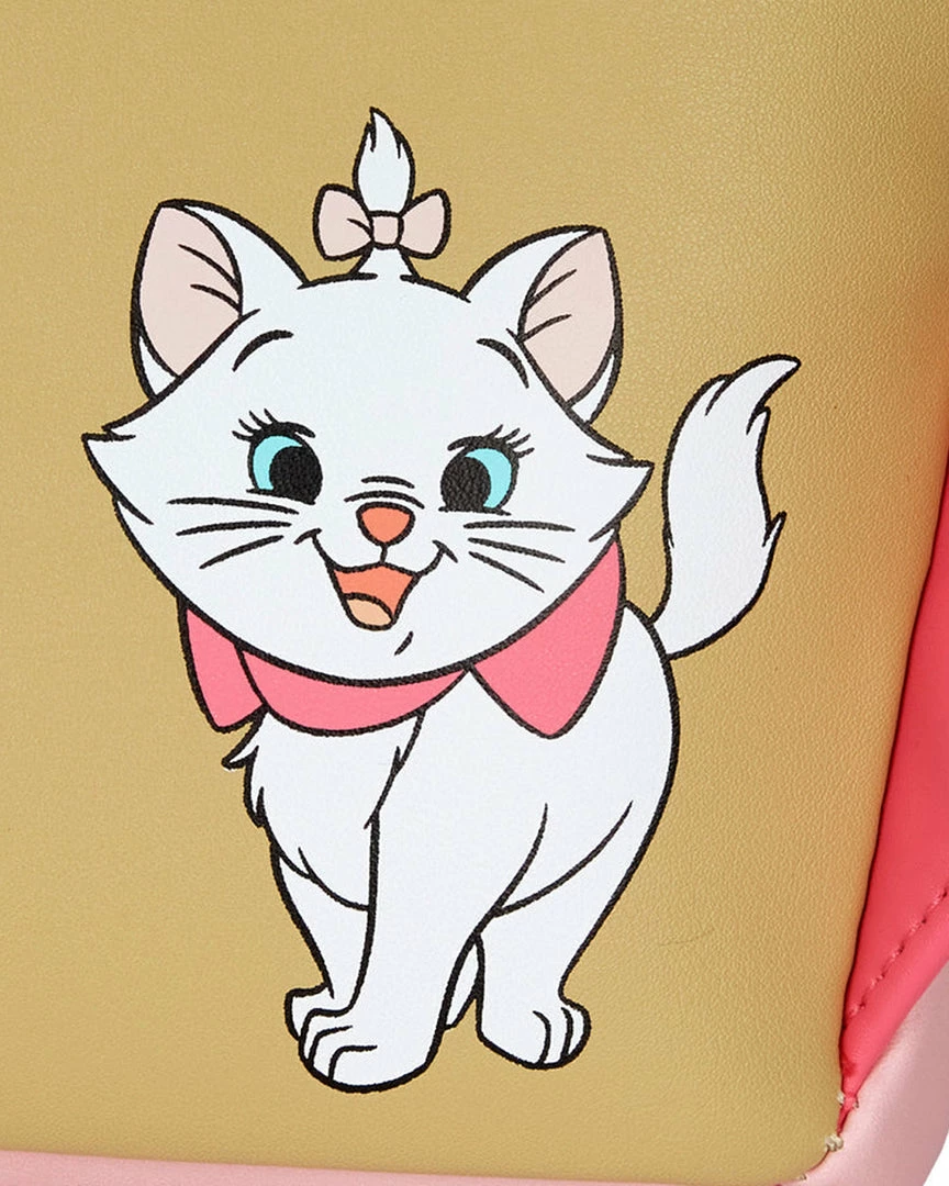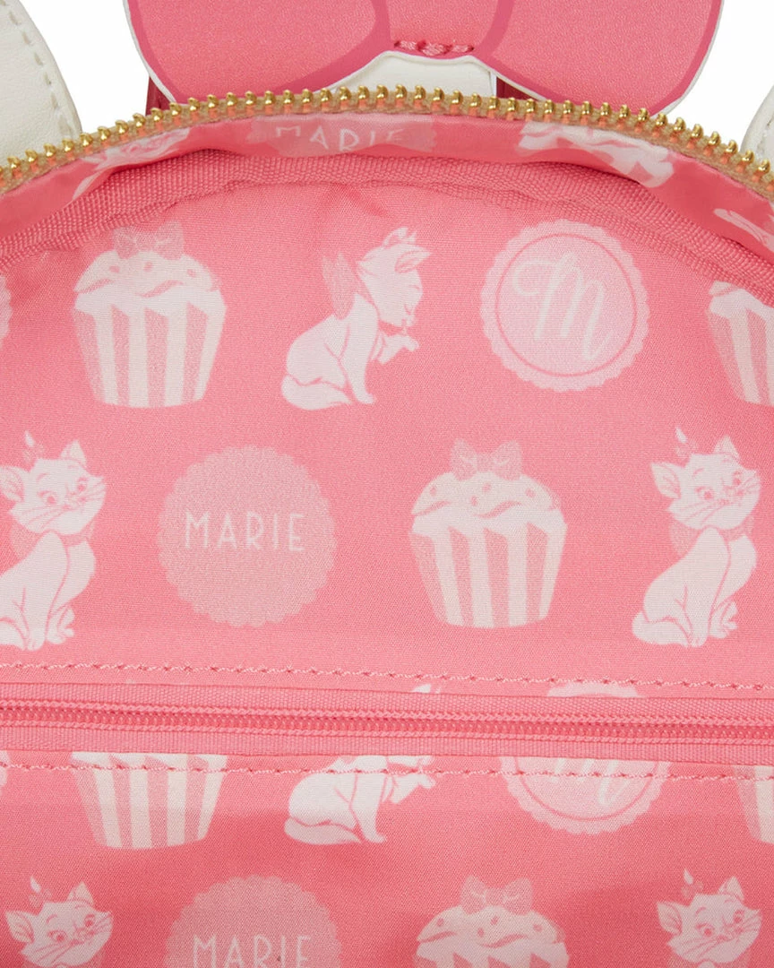 The front of the backpack is shaped like a white frosting, sprinkle cupcake with lace ruffles, topping the pink-striped cupcake liner. Marie’s ears poke out from beneath the white frosting, along with a tuft of her fur, pulled into a pink bow. On the back of the backpack, Marie poses. Note the coordinating lining, which carries a Marie and cupcake motif pattern. This backpack features pink adjustable straps, sturdy gold zippers and hardware, vegan leather (polyurethane), and embroidered, debossed, applique, printed, and lace details.