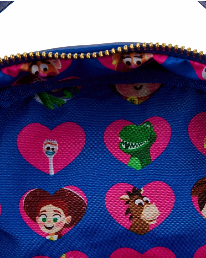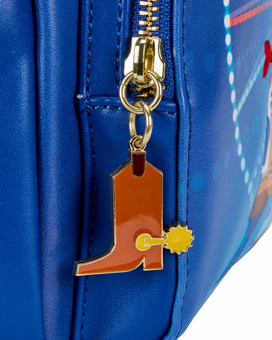 The wheels of fate are spinning in the amusement park, but Woody and Bo Peep manage to find each other. Celebrate this romantic encounter with the Toy Story Ferris Wheel Movie Moment Mini Backpack. On the front, Woody and Bo Peep gaze into each other’s eyes as they stand before the Ferris wheel, which sparkles at night. From above, several characters look down on the scene, including Buttercup, Mr. and Mrs. Potato Head, Rex, Karen Beverly, Bonnie, Jessie, Bullseye, and Buzz Lightyear. On the back, Slinky Dog and Hamm join Woody, Bo Peep, Jessie, Buzz Lightyear, Rex, and Bullseye as they make an encore appearance.