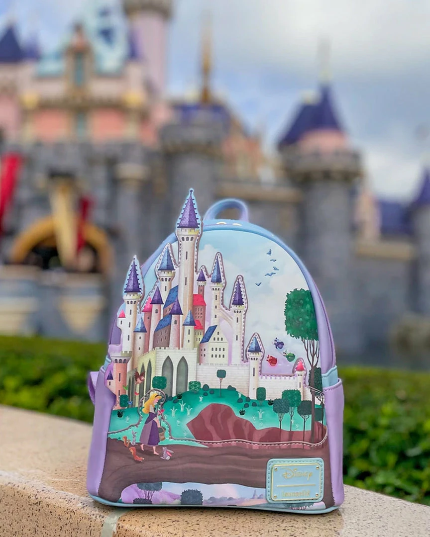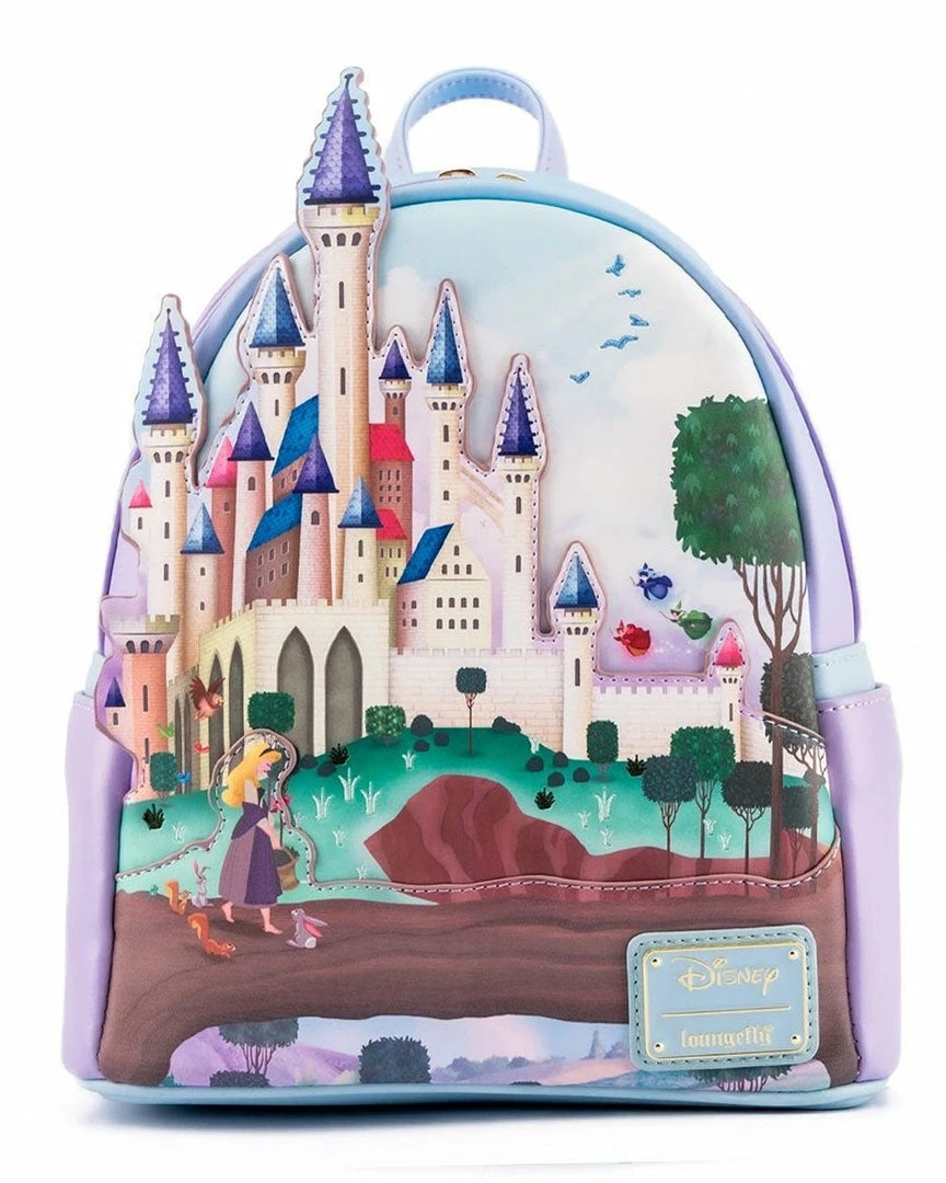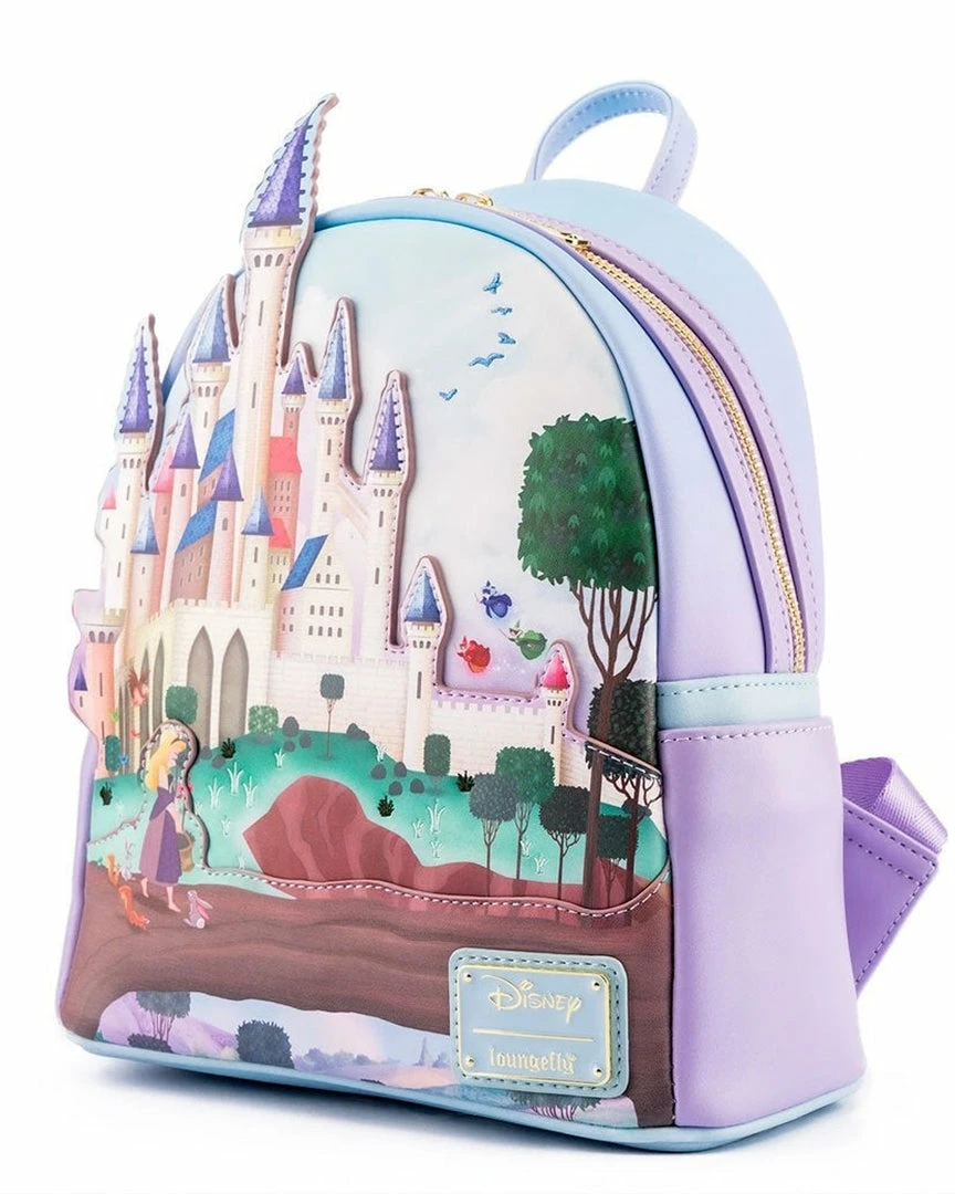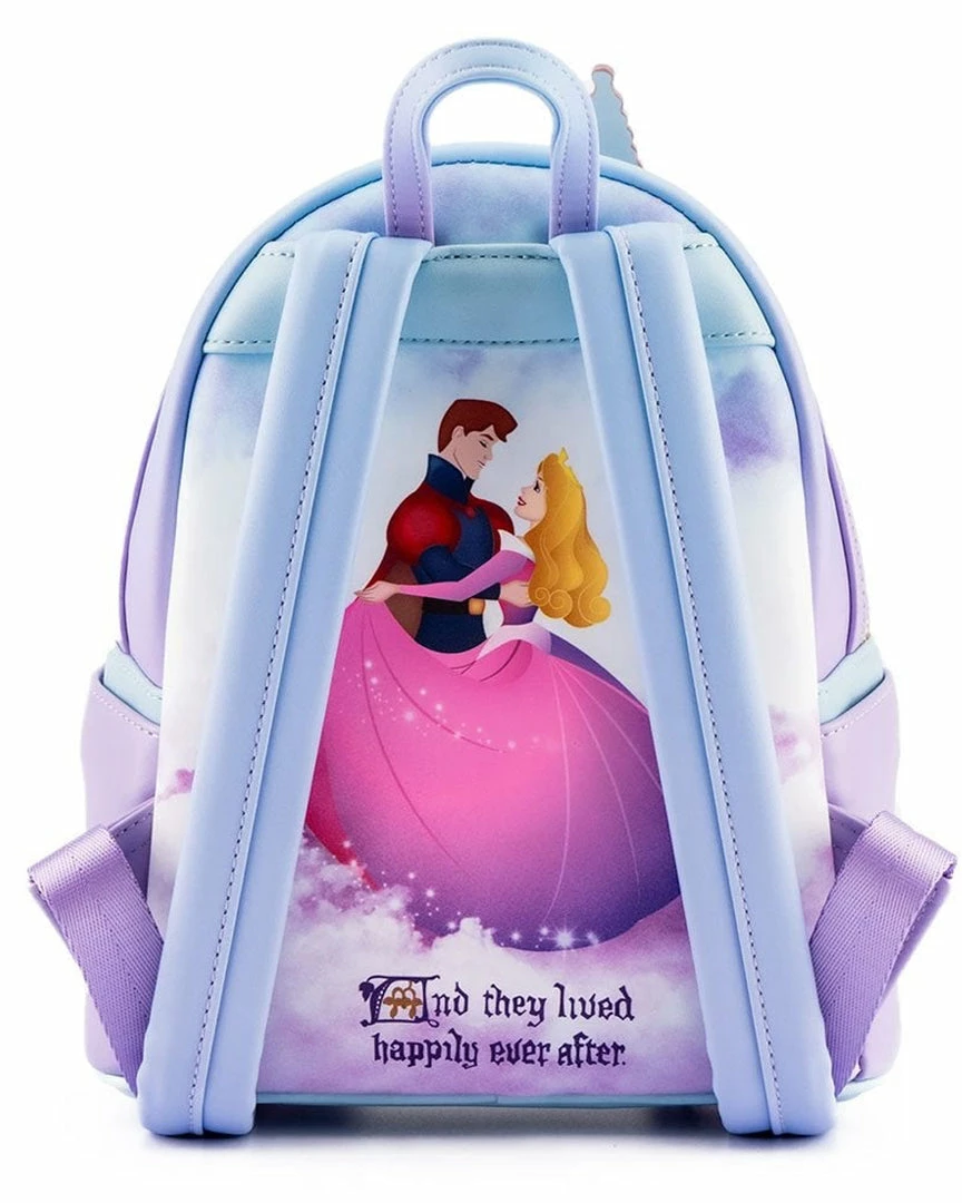 Live happily ever after with this Loungefly Sleeping Beauty Castle Mini Backpack. Since 1959, Disney’s Sleeping Beauty has enchanted audiences with the possibility of “love’s true kiss.” Spells can be broken, with just a little fairy dust, and the interior lining of this backpack carries a magical fairy godmother motif to guard your possessions.