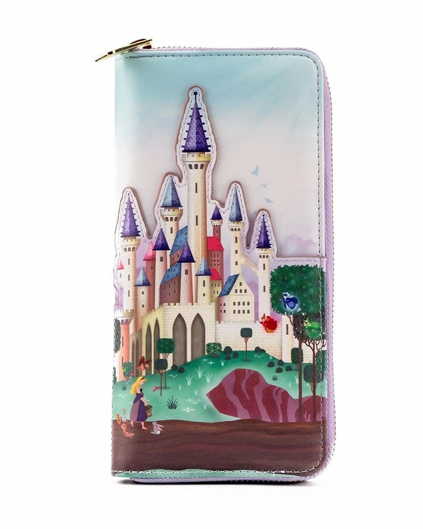The wallet, with gold-colored zipper hardware, includes printed dreamy scenes of Aurora, her castle, and her prince. The exterior features vegan leather (polyurethane).