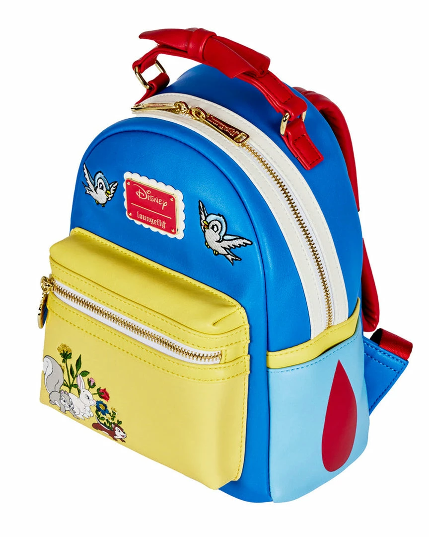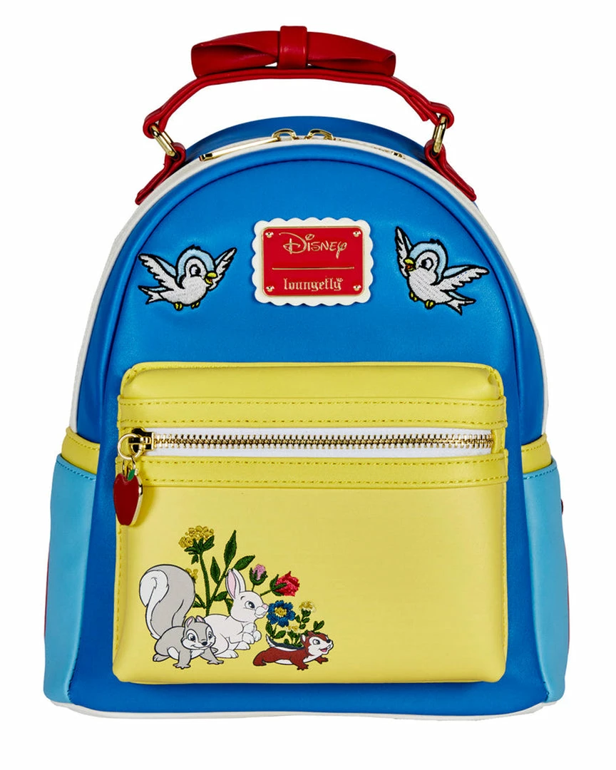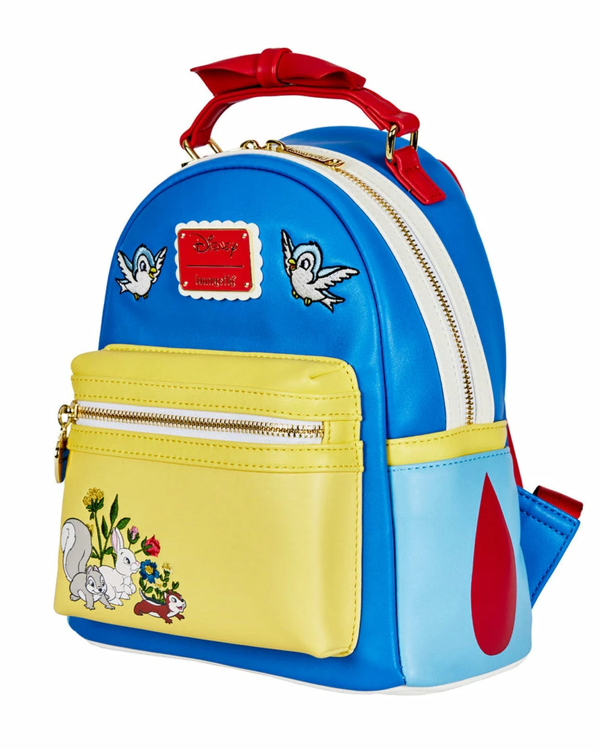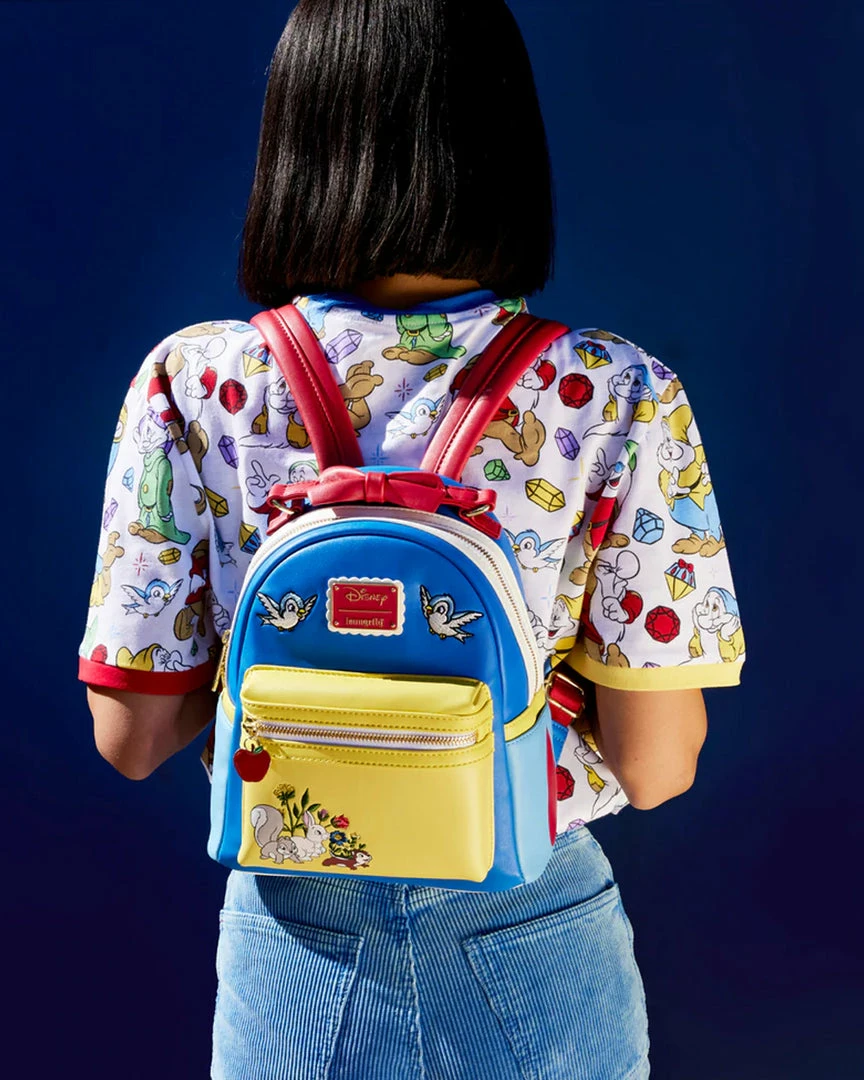 “With a smile and a song,” woodland creatures lend a hand to cheer Snow White. Their adorable presence is wrapped up with a bow on this 85th Anniversary Collection Loungefly Snow White 85th Anniversary Cosplay Mini Backpack. On the front of the backpack, curious woodland creatures gather. On the back, the creatures draw close, near Snow White. Above her, the words “Fairest of them all” appear. A red bow handle arcs over the top of the backpack. Note the coordinating inside lining, which includes a special 85th Anniversary Collection motif of Snow White and various woodland creatures. This backpack is the perfect accessory to complete any Disney outfit.