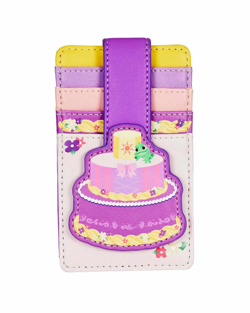 Pascal practically glows with excitement, atop a cake fit for a princess. Celebrate Rapunzel’s journey home with this Loungefly Tangled Rapunzel Cake Cosplay Card Holder