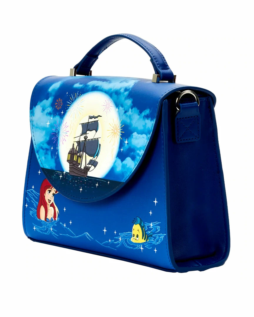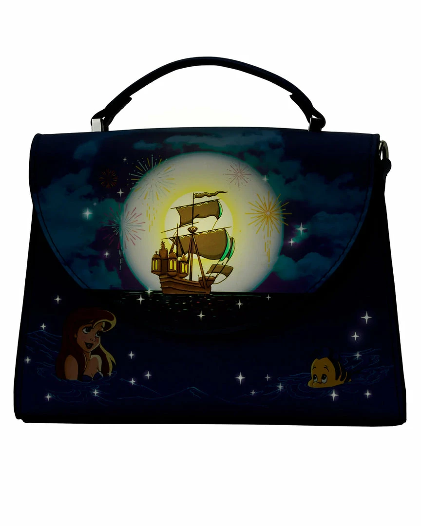 From under the sea, Ariel and her friends have surfaced. Make them a part of your world with this Loungefly The Little Mermaid AAriel Fireworks Glow in the Dark Crossbody Bag.
