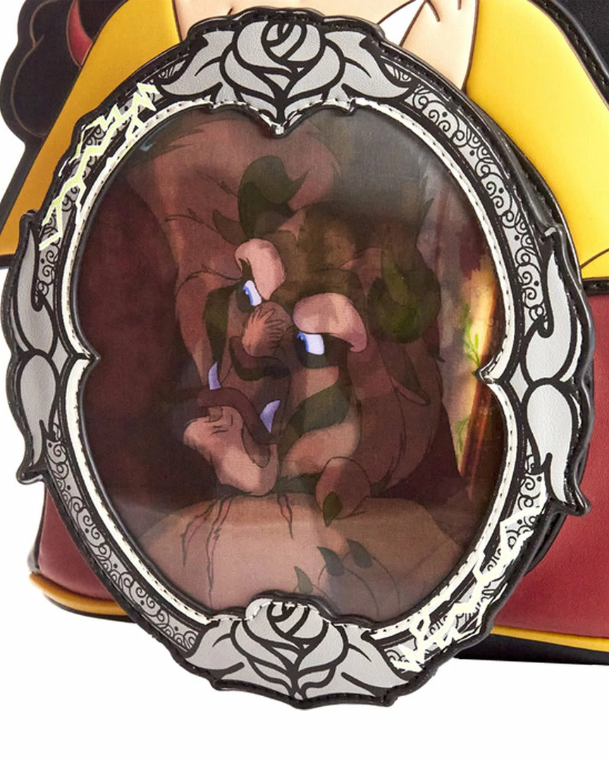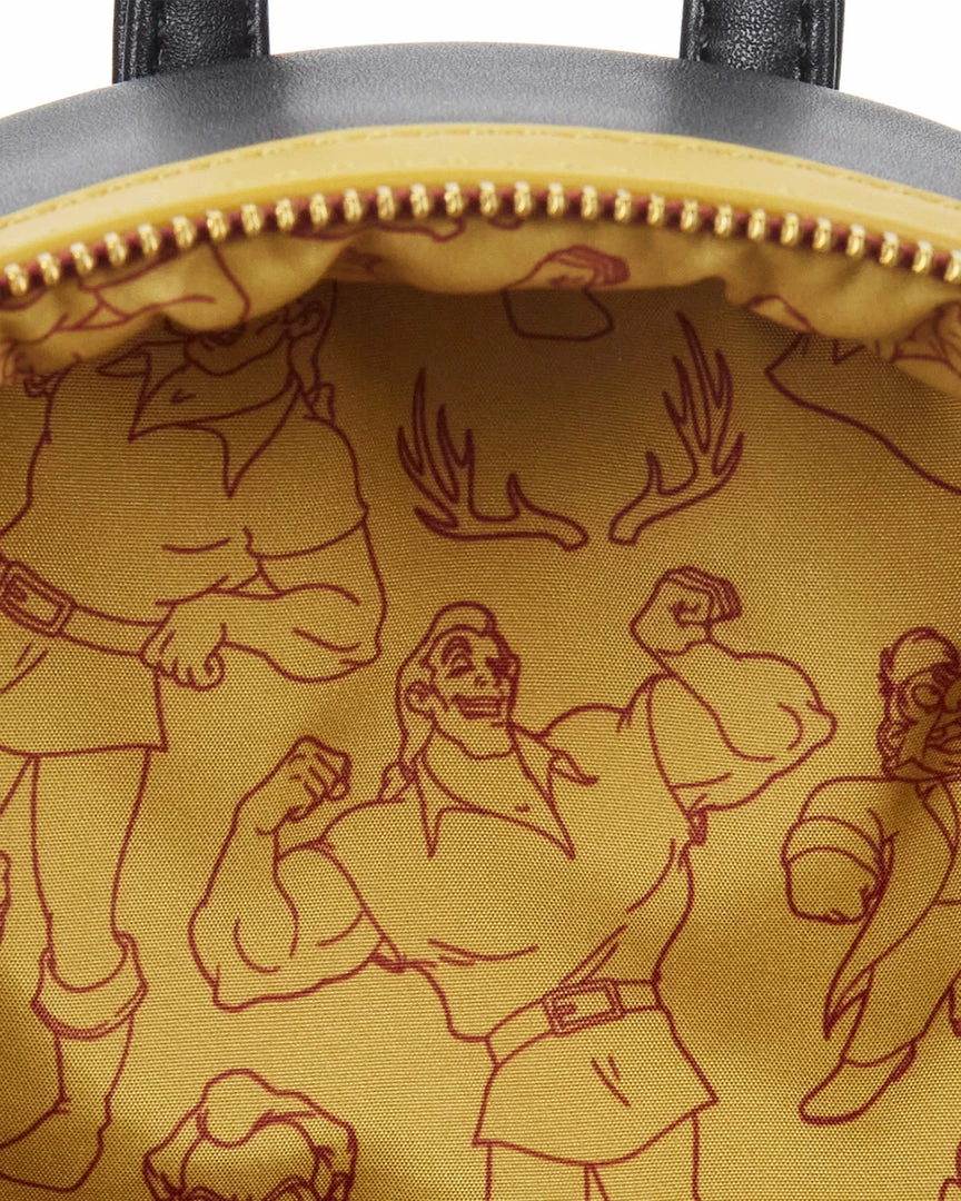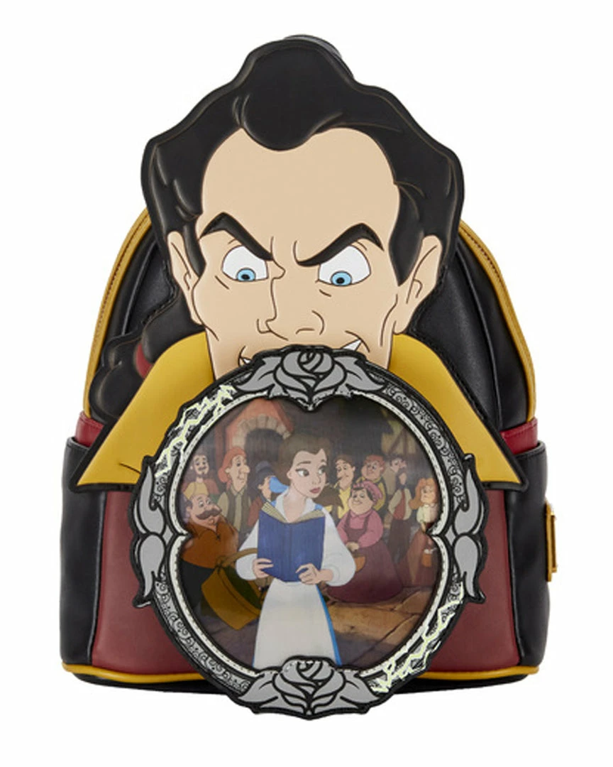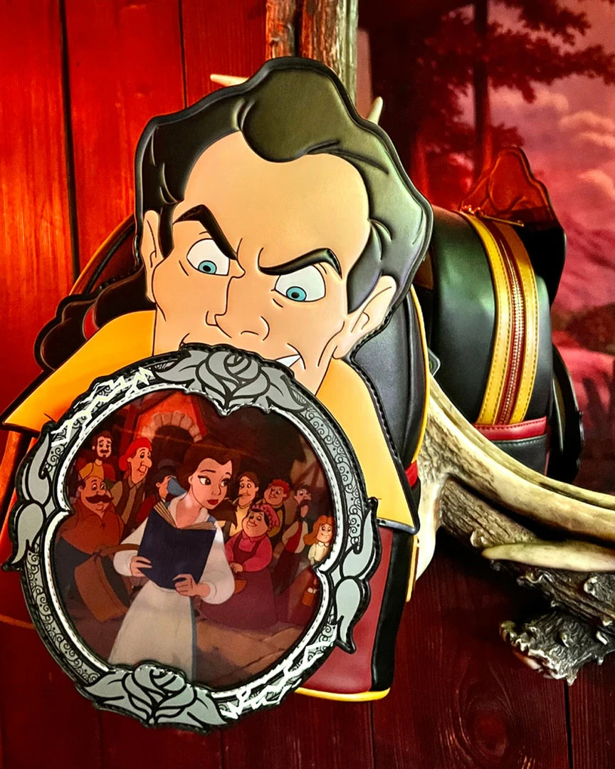 Always flexing, Gaston believes he’s set to win hearts and conquer the day. Make him possessive of your possessions with this Loungefly Beauty and the Beast Gaston Villains Scene Mini Backpack. The backpack depicts a jealous and greedy Gaston, looking down on the image of the Beast reflected in the hand-mirror. From another angle in the mirror, Belle appears with a book, while the townspeople gather in the background. Lettering on the back side of the backpack reads, “biceps to spare.”