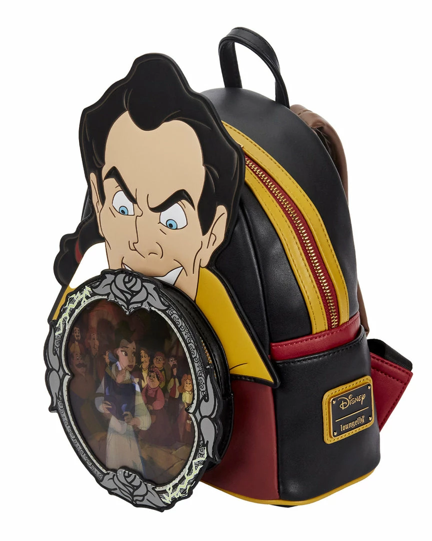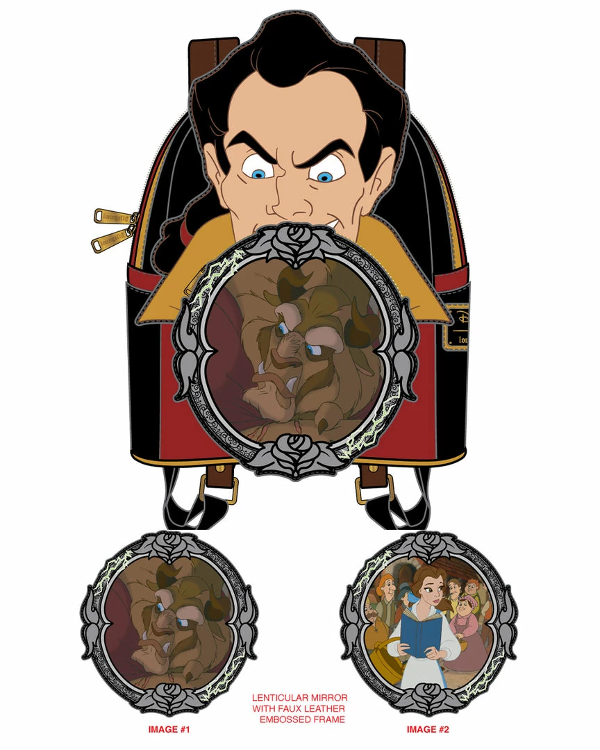 Backpack features include adjustable shoulder straps, antique gold hardware, side pockets, and applique, debossed, lenticular, and printed details. The exterior is fashioned from vegan leather (polyurethane). Note the lining, which carries a red and gold motif of Gaston showing off his biceps.