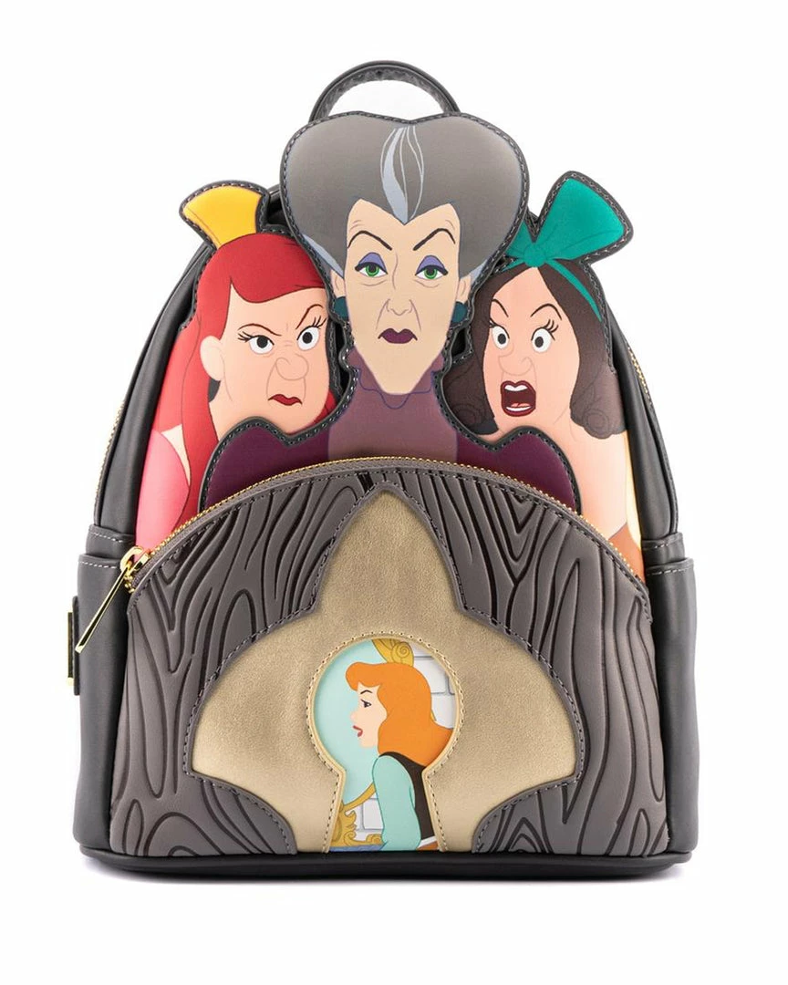 They key to a villainous outfit is the accessories. The Loungefly Cinderella Evil Stepmother and Stepsisters Villains Scene Mini Backpack is here to rule the roost. Through a golden keyhole you’ll find Cinderella, while her stepmother and stepsisters loom over the view with unapproving looks. On the back you’ll find Jaq and Gus carrying the key that may set Cinderella free.