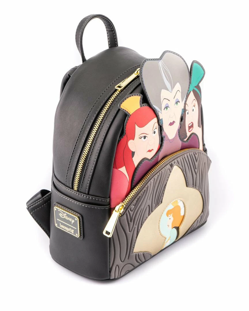 The Loungefly Cinderella Evil Stepmother and Stepsisters Villains Scene Mini Backpack is made of vegan leather (polyurethane). Bag has adjustable shoulder straps, sturdy metal hardware, and features: applique, metallic, and printed details. Take note of the coordinating pattern of the inside lining fabric.