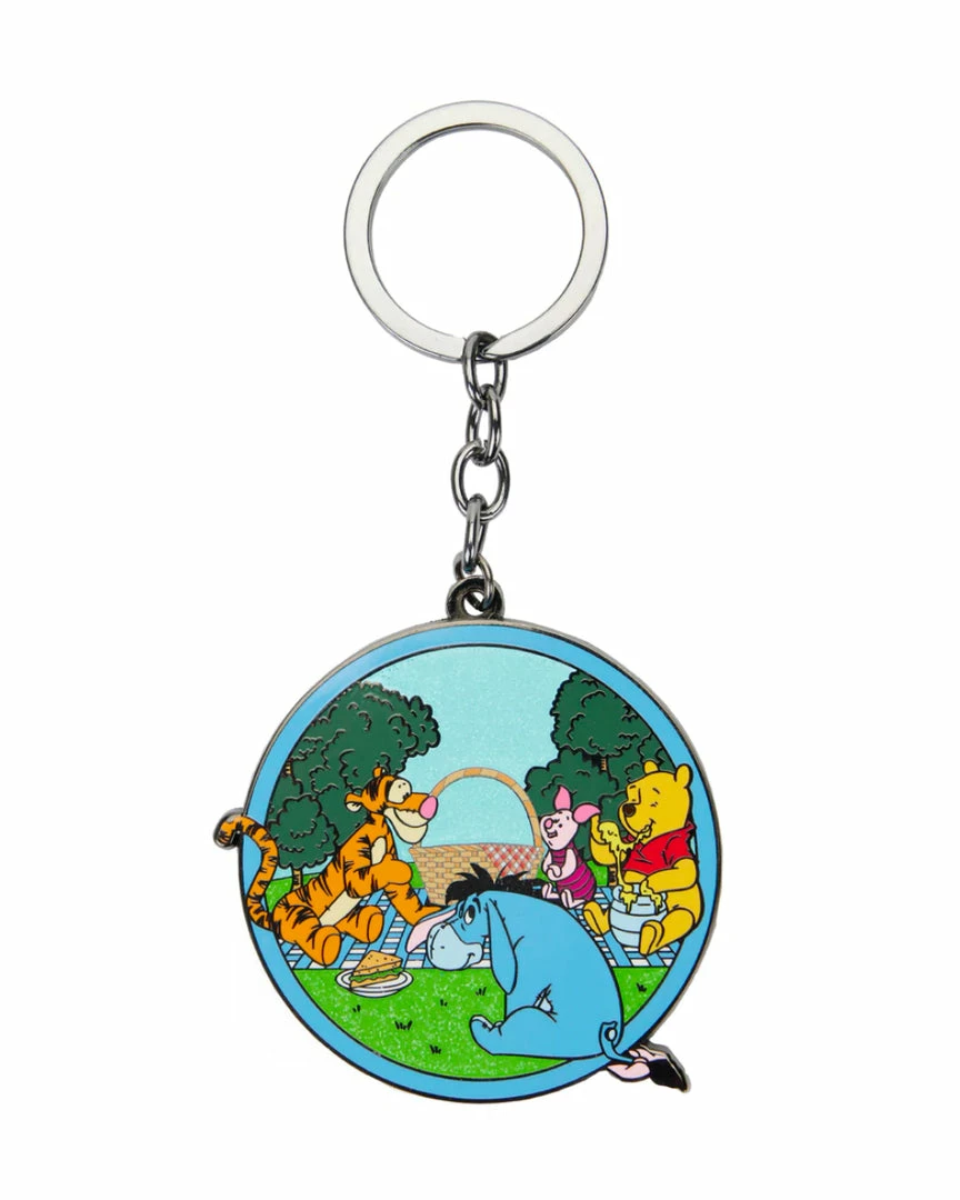 Join Winnie the Pooh and his friends of the Hundred Acre Woods for a delicious picnic. Take them with you on your adventures with this Winnie the Pooh Picnic Scene Keychain. Eeyore, Tigger, Piglet, and Winnie-the-Pooh are all there, against a glitter background sky, and the grass sparkles with green glitter details.Â