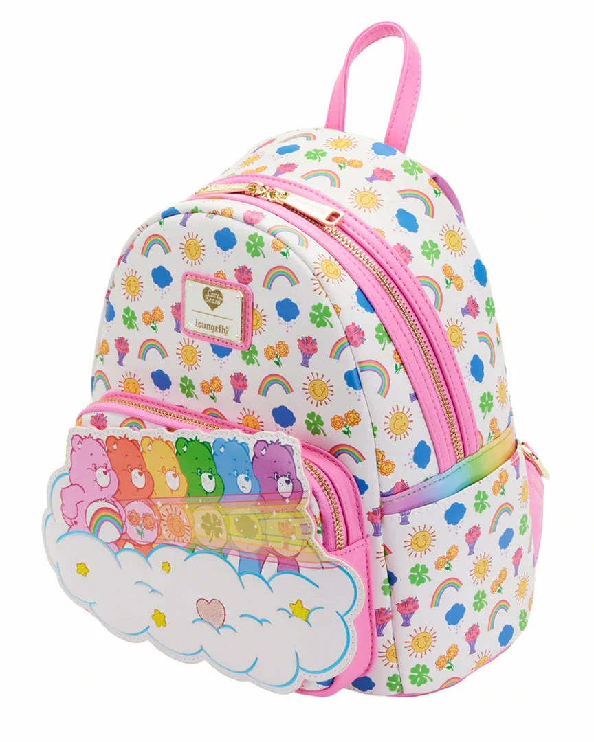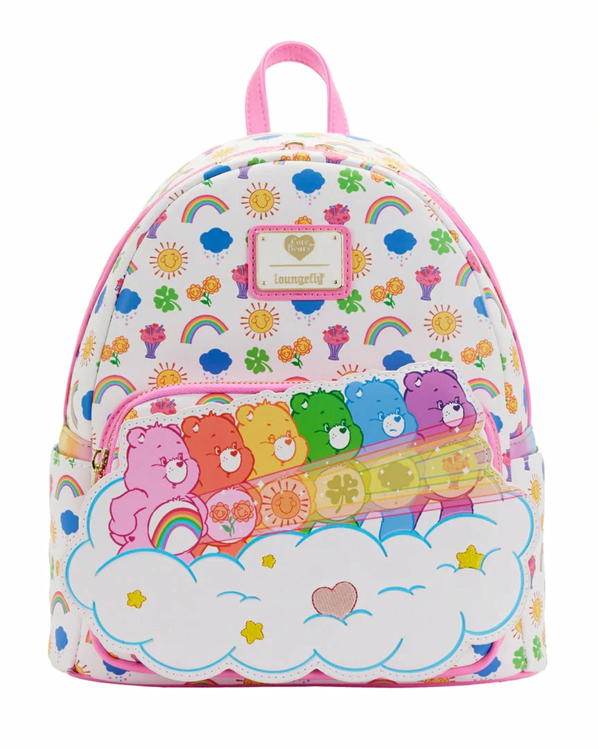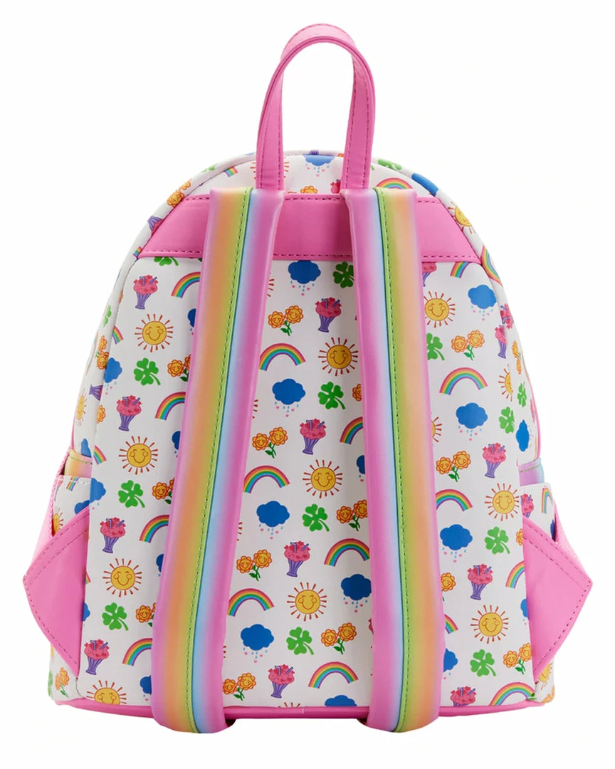 Celebrate 40 years of love and kindness with the Care Bearsā¢! The Loungefly Care Bears Stare Mini Backpack is here to brighten your day. On the front pocket, Cheer Bearā¢, Friend Bearā¢, Funshine Bearā¢, Good Luck Bearā¢, Grumpy Bearā¢, and Share Bear⢠have gathered to perform the Care Bear Stare as they stand together on a starry cloud. Their original belly badge icons are displayed in a print that covers the rest of the mini backpack, while a rainbow pattern is displayed on the side panels and backpack straps. This joyful accessory adds cheer to any outfit and has plenty of room to hold supplies for helping others in need.
