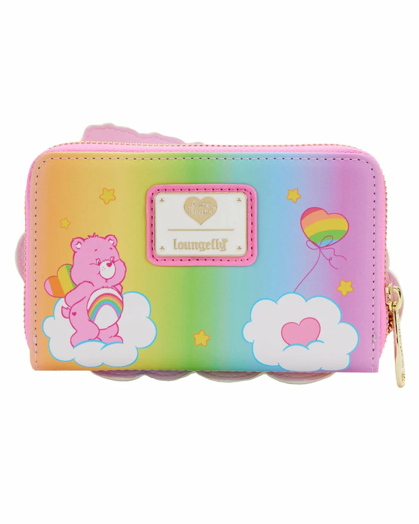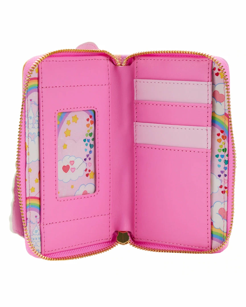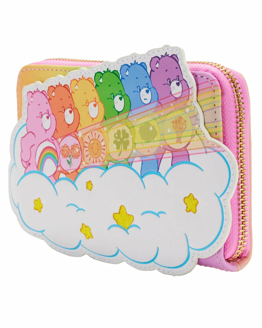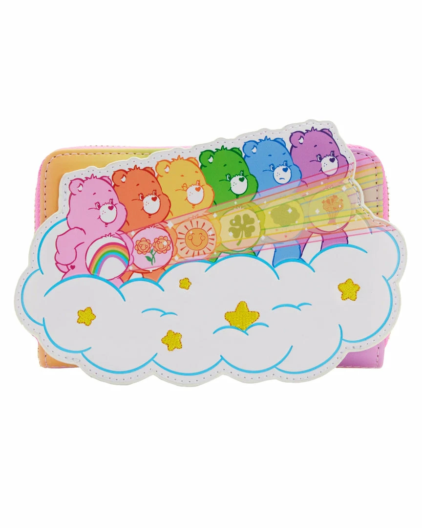 Celebrate 40 years of love and kindness with the Care Bearsā¢! The Loungefly Care Bears Stare Zip Around Wallet is here to brighten your day. On the front, Cheer Bearā¢, Friend Bearā¢, Funshine Bearā¢, Good Luck Bearā¢, Grumpy Bearā¢, and Share Bear⢠have gathered to perform the Care Bear Stare as they stand together on a starry cloud. On the back, a starry rainbow background displays a scene where Cheer Bear has delivered some rainbow heart balloons. With five slots for holding cards and a clear slot for holding your ID, this joyful accessory has room to hold all your important items as you travel on any adventure.