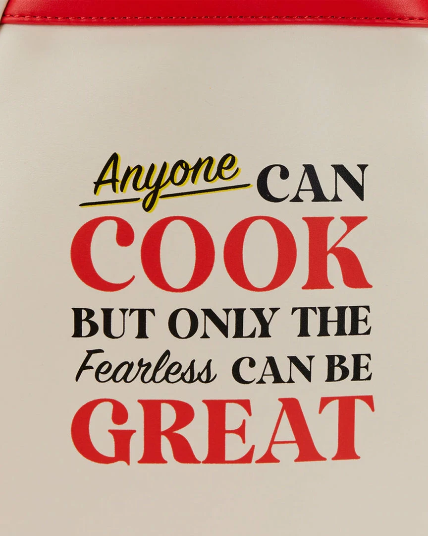 Sumptuous delights are simmering in the kitchen, and the secret to the sauce is under a hat. Capture your favorite animated cooking scenes and show your love for culinary treats with this Loungefly Disney-Pixar Ratatouille 15th Anniversary Linguini Cosplay Mini Backpack. On the front of this backpack, the top of Linguini’s head peaks out, his applique chef’s hat extending beyond the borders of the backpack dome. Turn the lights off, and the secret to Linguini’s success is revealed: Remy’s shape glows from underneath! A hidden pocket is nestled behind Linguini’s hair, topped off with an enamel zipper charm of a wedge of cheese—just for Remy. A side pocket features an adorable print of a wooden spoon and fork. On the back, a debossed message reads, “Anyone can cook, but only the fearless can be great.” This backpack is the perfect accessory for pairing with a Disney outfit, or for turning any outing into a magical and special occasion.