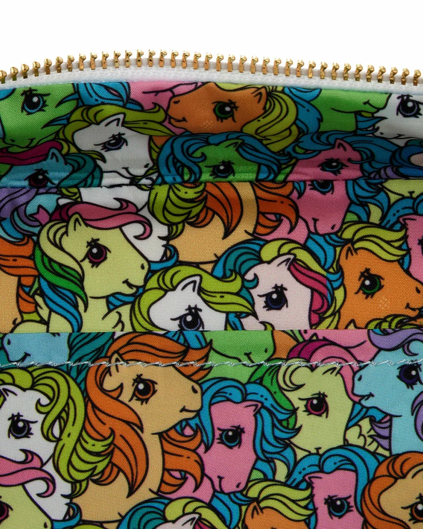 Make each day shine a bit brighter with the magic of a beloved childhood classic. The Loungefly My Little Pony® Castle Crossbody Bag is ready to dazzle your collection. This whimsical accessory portrays the Dream Castle, where Glory, Butterscotch, Sunlight, and Blossom have gathered to play. Open the functional drawbridge flap to reveal Parasol and Medley, who are eager to greet you! On the back, a bluebird flies above Skydancer, Medley, and Firefly who appear on clouds surrounded by stars and rainbows. This crossbody bag adds a dash of flair to any outfit and is the perfect addition to your My Little Pony collection.