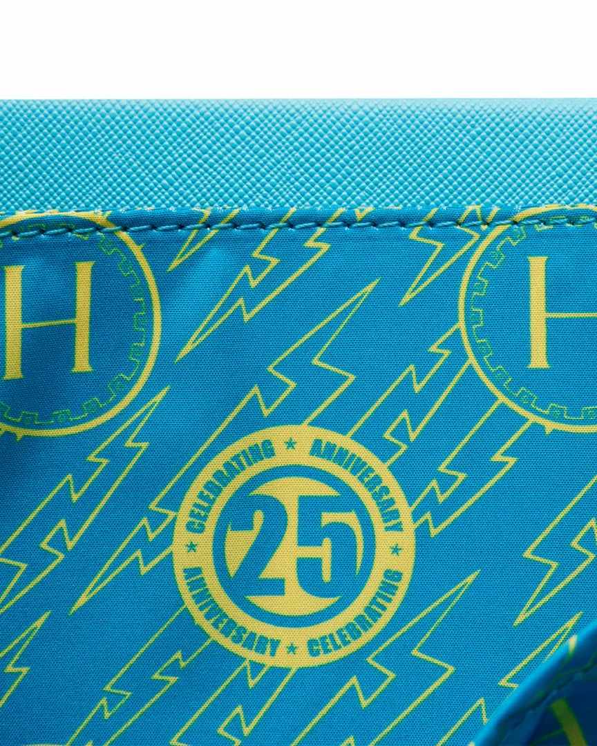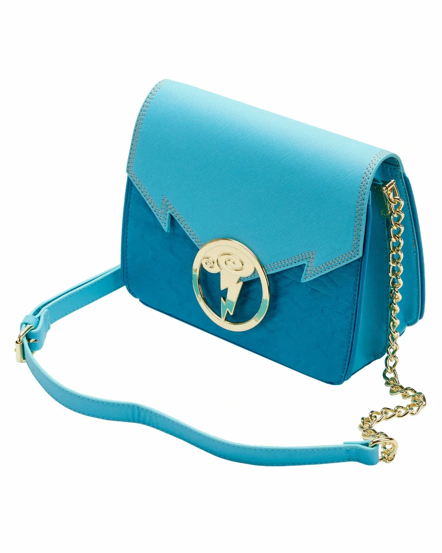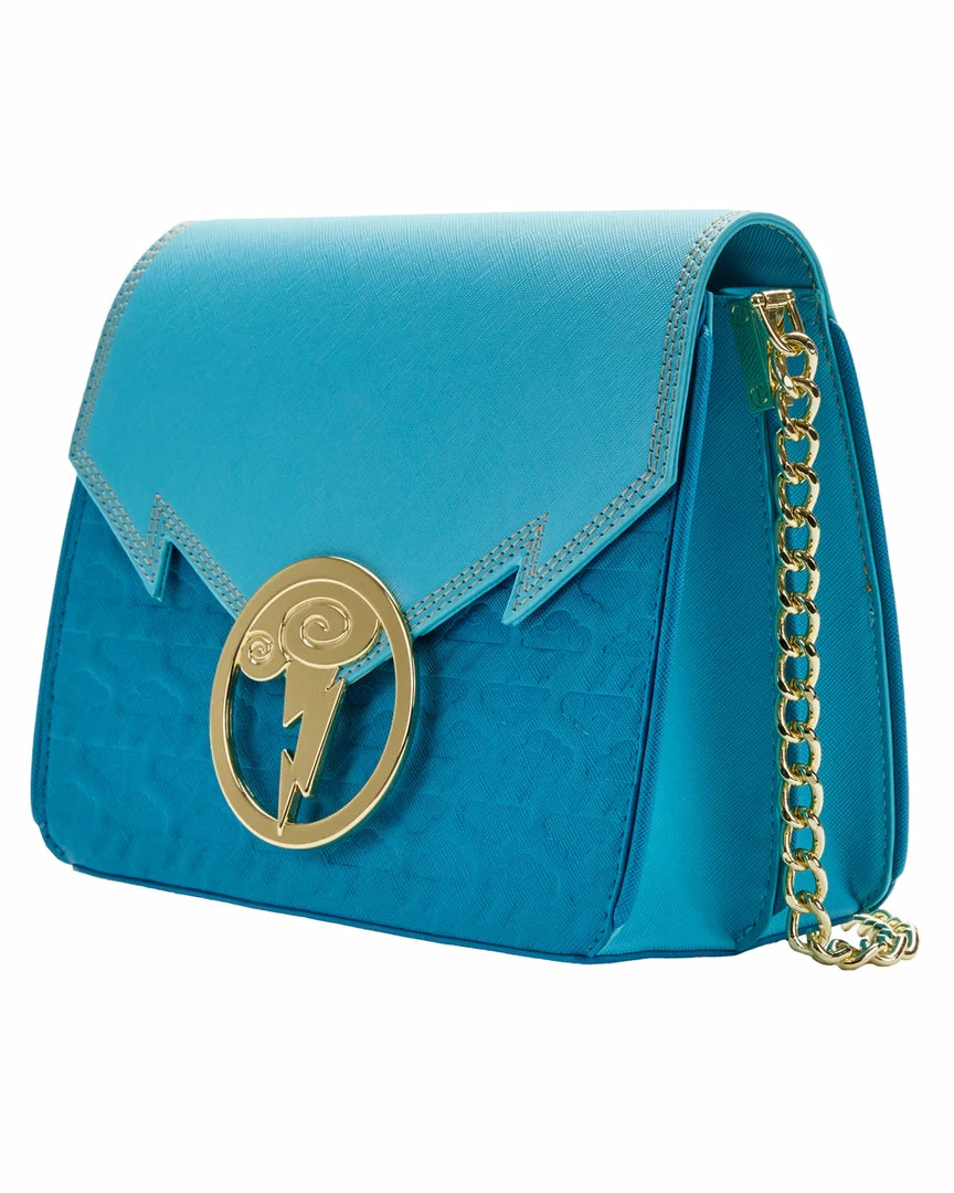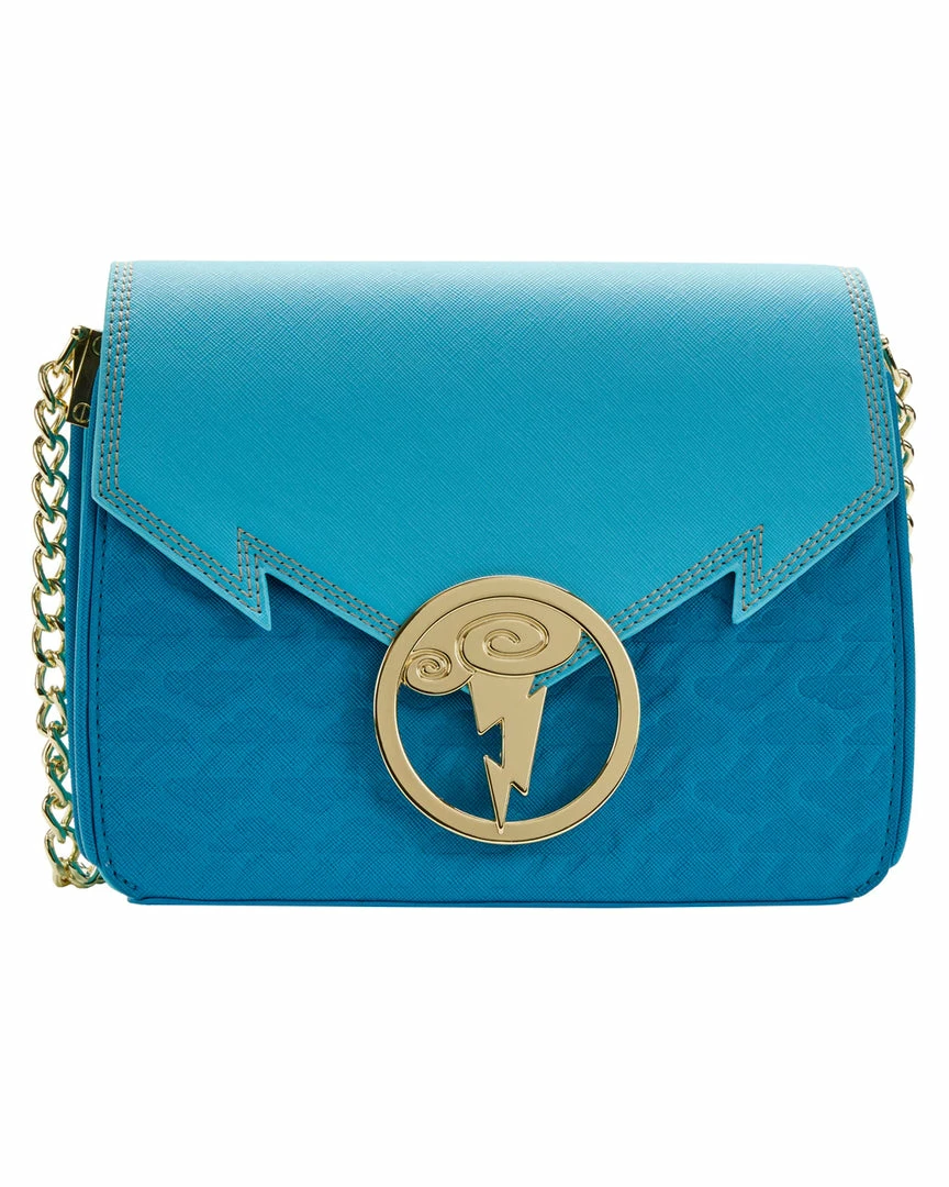Make an electrifying entrance with this Loungefly Disney Hercules 25th Anniversary Crossbody Bag. Thunderous applause awaits as you take this bag with you on all your journeys. An embroidered all-over-print of storm clouds and rain is bordered by accent stitching in gold. On the front, a stylish flap in a complementary blue cover clasps shut, lightning quick, with a gold molded metal closure, sealed with Hercules’ bolt of lightning. A gold metal chain shoulder strap finishes the look. The accordion-style sides, in a complementary blue color, reveal accents of strands of gold. This crossbody bag is the perfect accessory to pair with a Disney outfit or for transforming everyday outings into magical adventures.