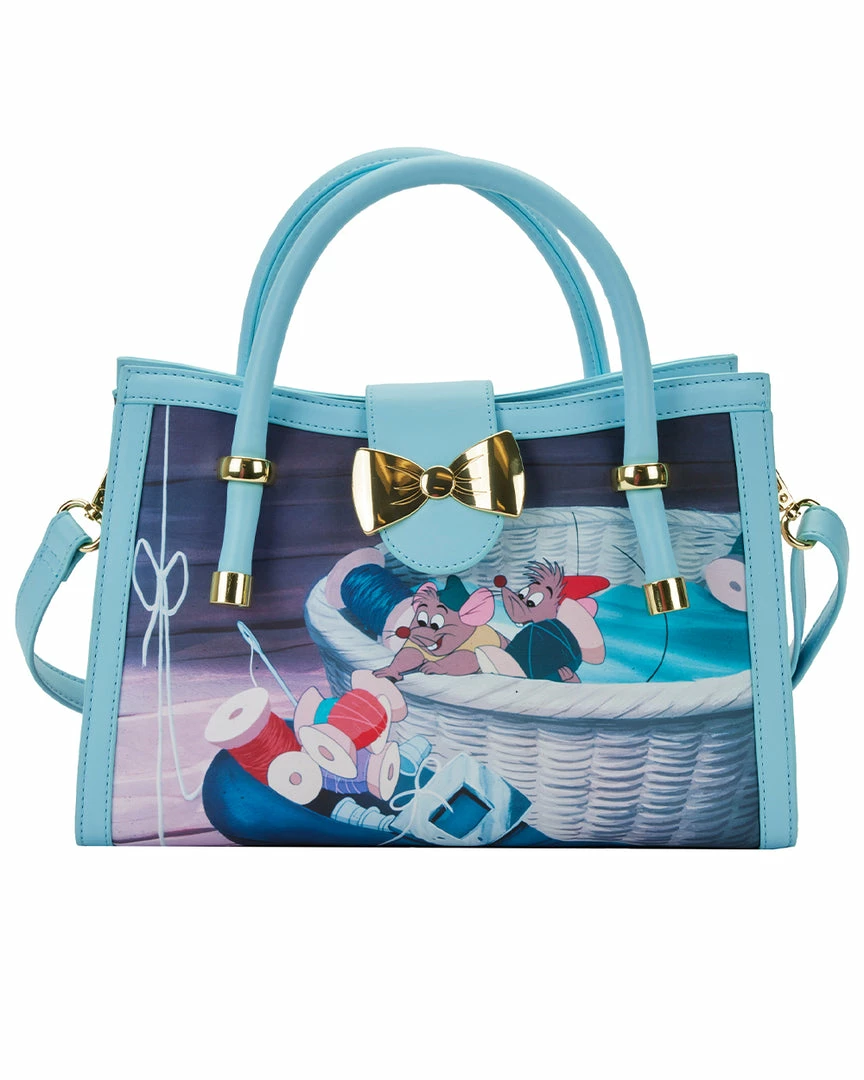 Cinderella’s dreams can come true with just a bit of help. Celebrate the magical moments of Disney’s Cinderella with the Loungefly Cinderella Princess Scenes Crossbody Bag. Each panel of this charming bag features a unique scene from the animated classic. On the front, Cinderella’s companions Gus and Jaq collect supplies to transform a dress that is fit for a ball. On the back, Cinderella runs to her carriage as the clock strikes midnight. The left side panel features Cinderella twirling with her handmade gown, while the right side panel features a romantic ballroom dance with Prince Charming. No need to worry about turning into a pumpkin! This dreamy crossbody bag makes a great wardrobe accessory at any time of day and will ensure that none of your essentials get left behind.
