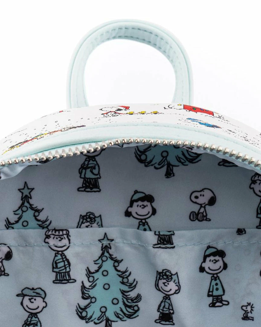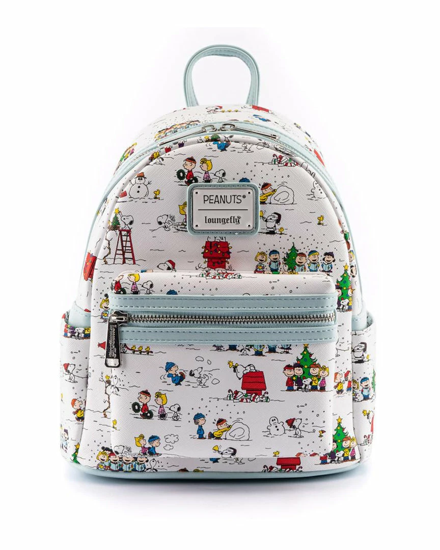 Spread good cheer this season with the Loungefly Peanuts Happy Holidays Mini Backpack. Charlie Brown, Snoopy, Woodstock, Lucy, Sally, and more can be seen enjoying various winter-time activities such as sledding, caroling, gift giving, and more. This darling design is sure to spark smiles. Any Peanuts fan would love this beautiful bag.