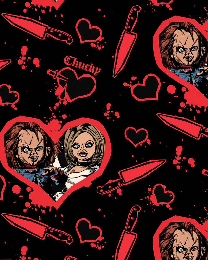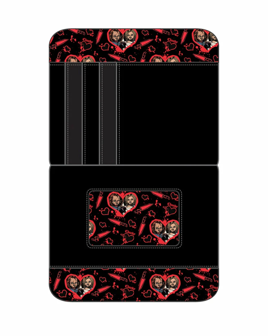 Schedule a playdate with a killer couple! Escape with the Loungefly Bride of Chucky Zip Around Wallet. On the front, Chucky and Tiffany (in her bridal outfit), pose against a black backdrop, spattered in blood. On the back, the word Chucky appears, along with a red heart with a dagger through it. Inside the wallet, there are 4 slots for holding cards and 1 clear slot for holding your ID. It’s the perfect accessory to accompany you on your daily haunts.