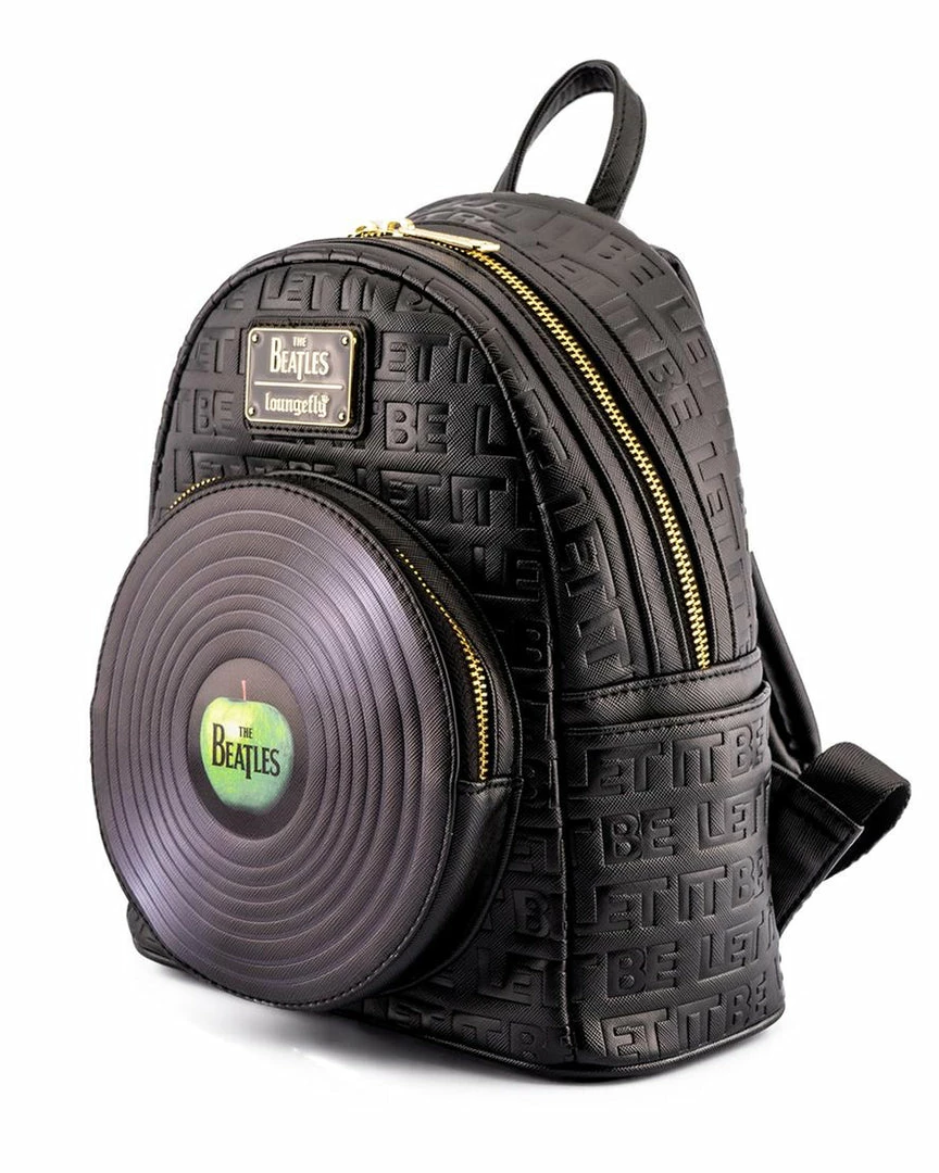 In times of trouble this Loungefly The Beatles Let It Be Vinyl Record Mini Backpack will bring you joy as well as utility. Carry your journey’s necessities and the memories of The Beatles music with this sleek and subtle mini backpack. The front pocket is shaped like a vinyl record, featuring the green apple The Beatles logo. Printed in light relief across the black backpack is “Let It Be” the song that inspired this design.