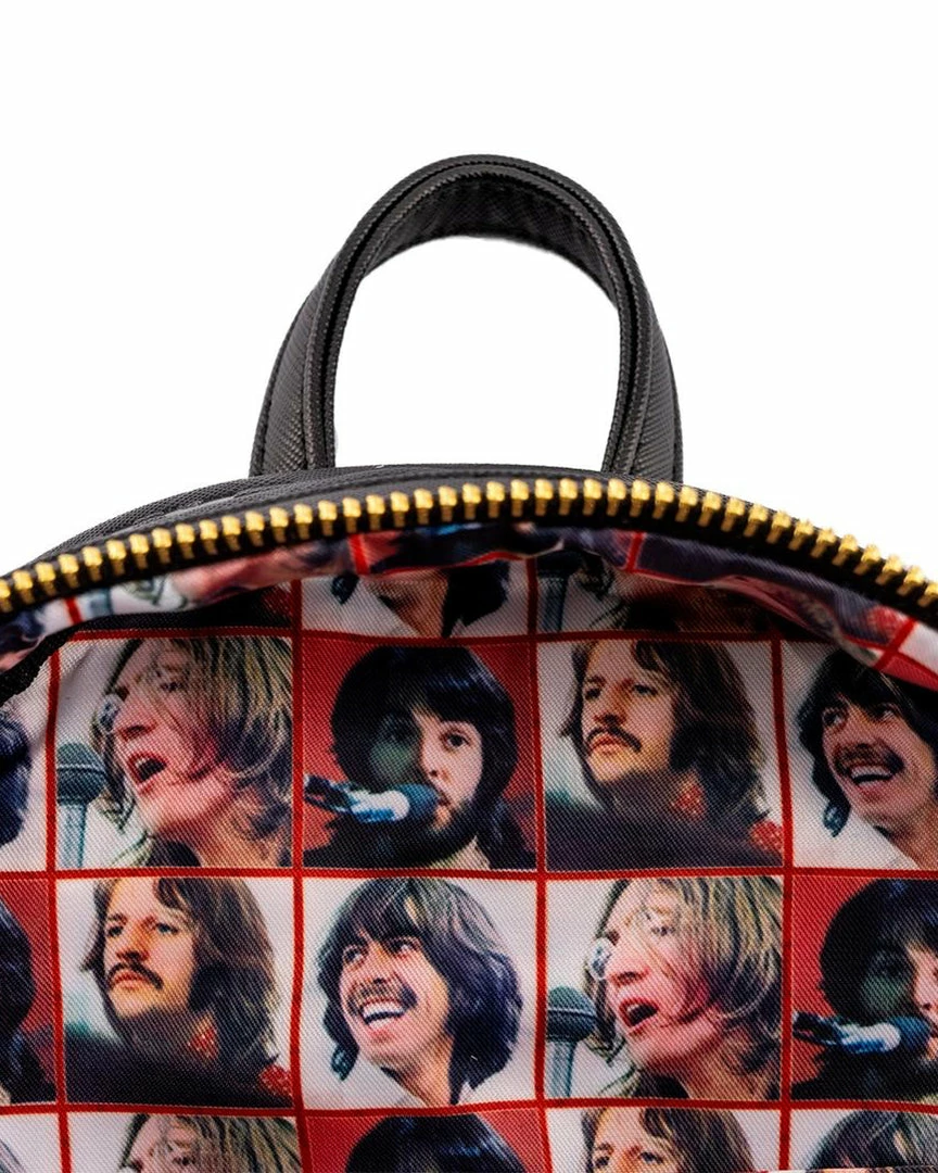 The Beatles Let It Be Vinyl Record Mini Backpack is made of vegan leather (polyurethane) with vinyl trim. Bag has adjustable shoulder straps, sturdy metal hardware, and features: debossed, and printed details. Take note of the coordinating pattern of the inside lining fabric. is an officially licensed The Beatles product.
