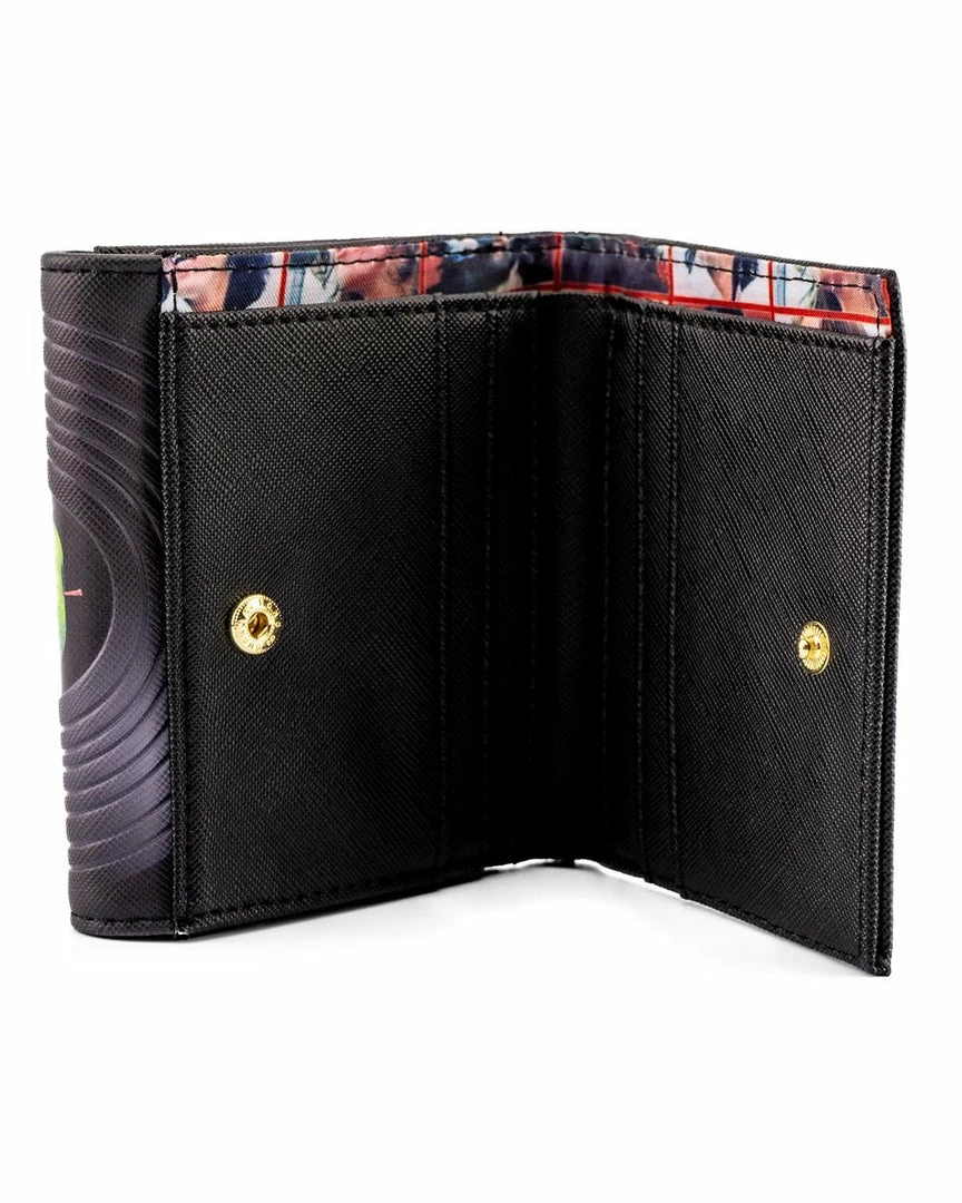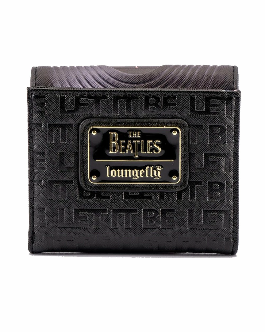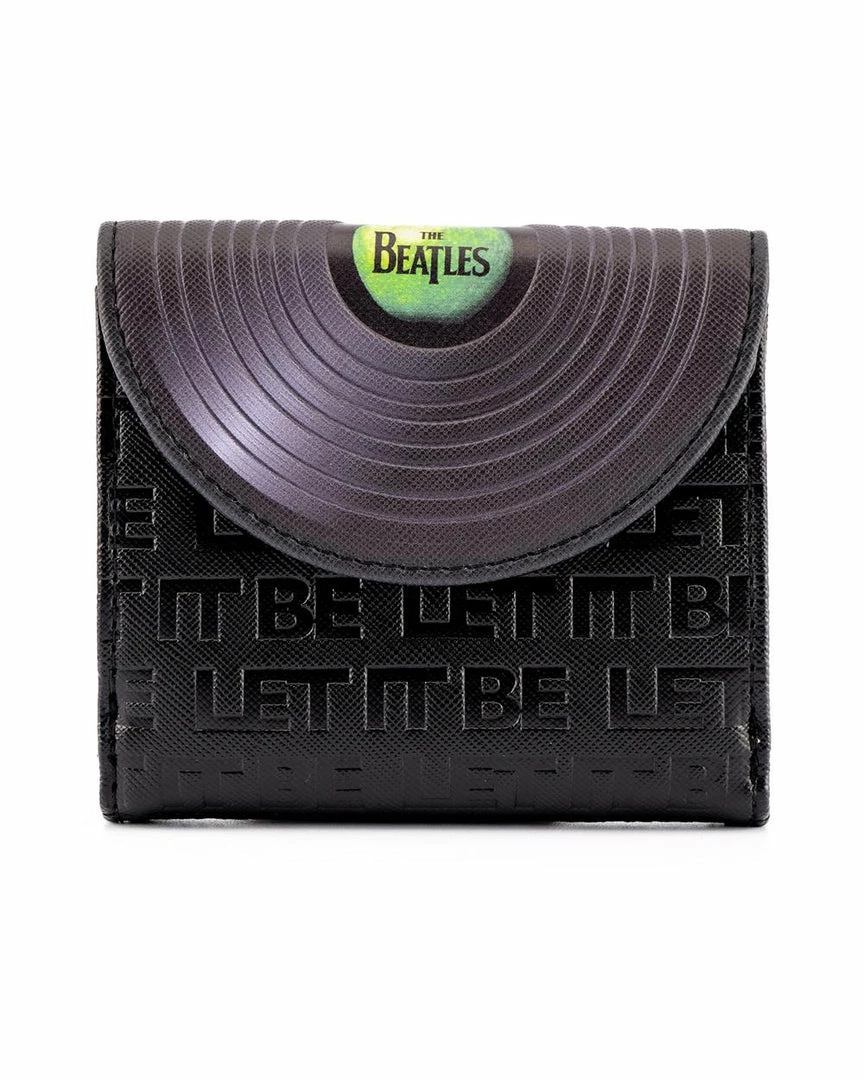 In times of trouble this Loungefly The Beatles Let It Be Vinyl Record Bi-Fold Wallet will bring you joy as well as utility. Carry your journey’s necessities and the memories of The Beatles music with this sleek and subtle wallet. Printed in light relief across the black background is “Let It Be” the song that inspired this design, and the top fold features a vinyl record with the green apple The Beatles logo.