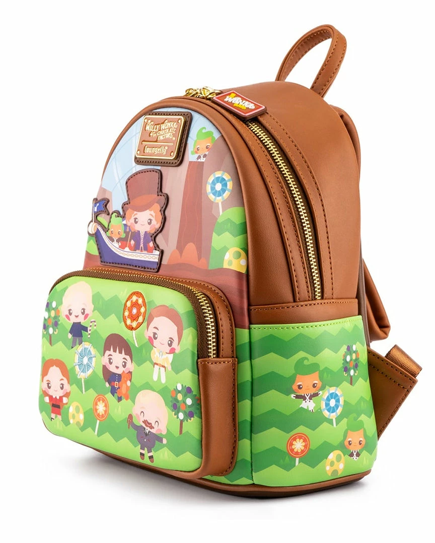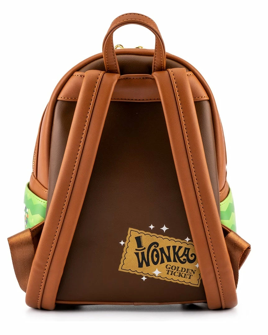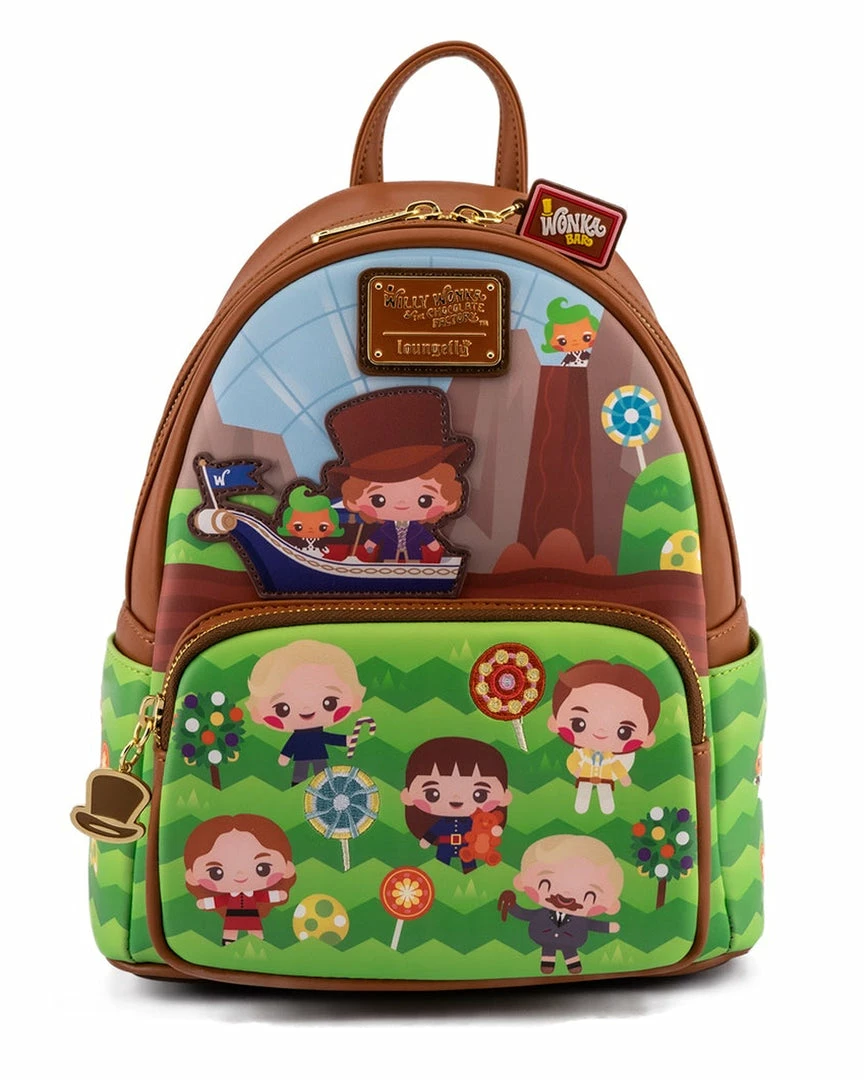 Celebrate the 50th Anniversary of Willy Wonka and the Chocolate Factory by embarking on a sweet adventure with the Loungefly Willy Wonka and the Chocolate Factory 50th Anniversary Mini Backpack. It features a scented enamel charm! Willy Wonka and one of his Oompa Loompa assistants traverse the chocolate river, while the children on the shore stand among the sweets. The Loungefly Charlie and the Chocolate Factory 50th Anniversary Mini Backpack is your golden ticket to a sweet Willy Wonka-inspired outfit.