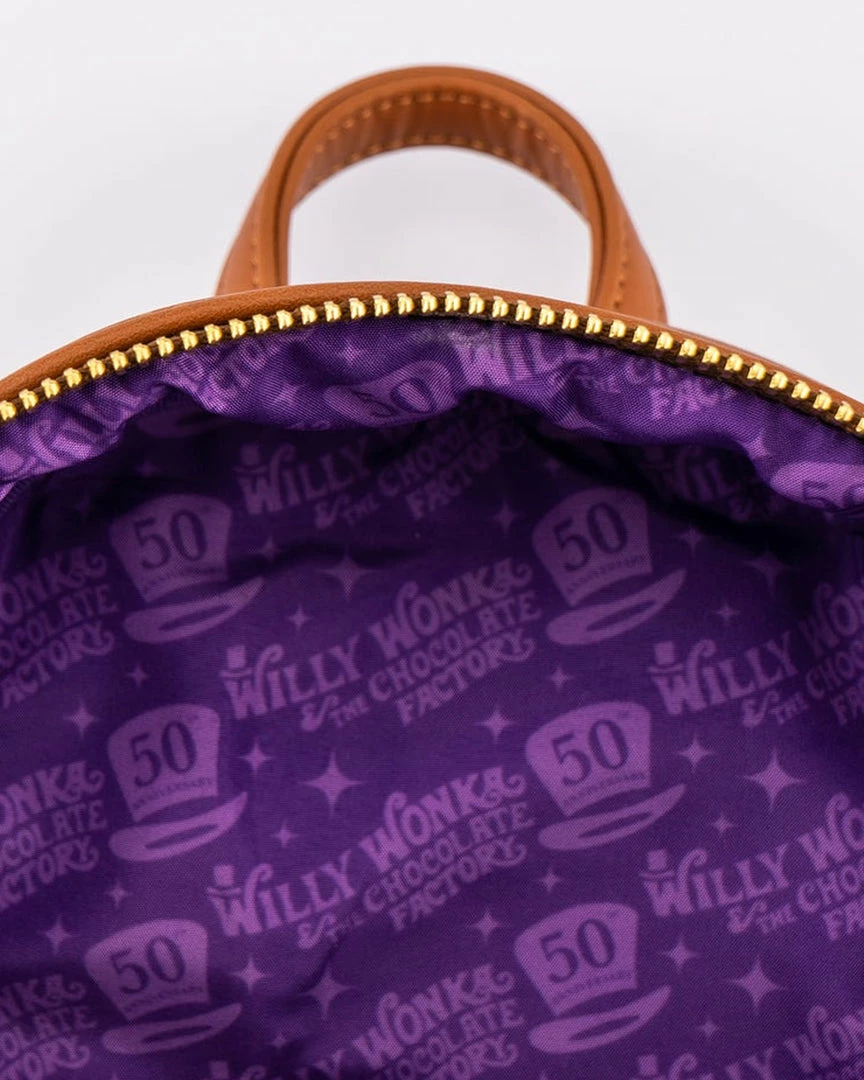 The Willy Wonka and the Chocolate Factory 50th Anniversary Mini Backpack is made of vegan leather (polyurethane). Bag has adjustable shoulder straps, sturdy metal hardware, and features: applique, embroidered, enamel and metal zipper charm, and printed details. Take note of the coordinating pattern of the inside lining fabric.